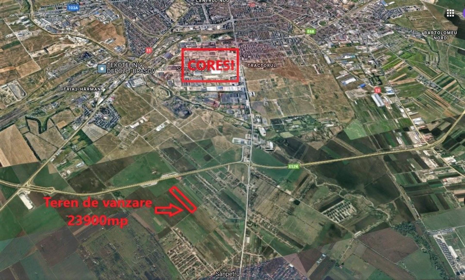 Compania RE/MAX Central vă oferă în vederea achiziției în sistem de reprezentare exclusivă și comision 0% din partea cumpărătorului un teren în suprafață de 7100mp situat la intrarea în comuna Sânpetru, imediat după centura ocolitoare a Brasovului, pe partea dreaptă. Zona se află în plină dezvoltare imobiliară, în ultimii ani fiind construite sute de noi locuințe.