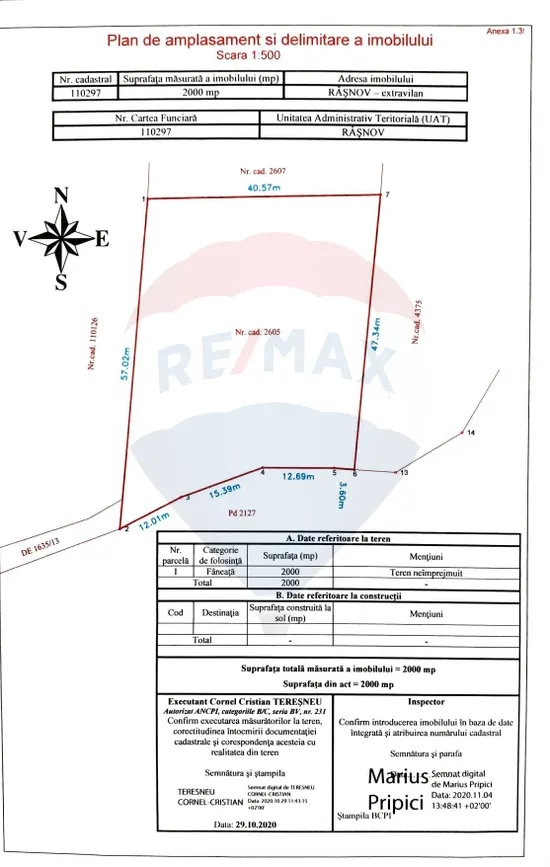 Compania RE/MAX Central vă oferă în vederea achiziției în sistem de reprezentare exclusivă și comision 0% din partea cumpărătorului un teren în suprafață de 2000 mp situat în Râșnov - zona Glăjerie.