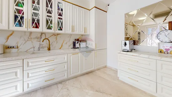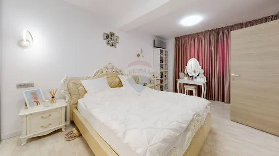 Finisajele sunt de tip Premium, pardoseala din living, holuri de acces, scari precum si placarile din bai sunt din piatra naturala tip marmura, ceea ce da valoare proprietatii, pardoseala din dormitoare este din parchet triplu stratificat, tamparia este din aluminiu, fiecare camera este echipata cu aer conditionat tip Daikin, sistemul de climatizare din living fiind ascuns, iar imobilul beneficaza de multiple zone de depozitare, fiind foarte bine impartit in ce priveste zona zi si cea de seara. Incalzirea se face prin centrala proprie cu incalzire de pardoseala.