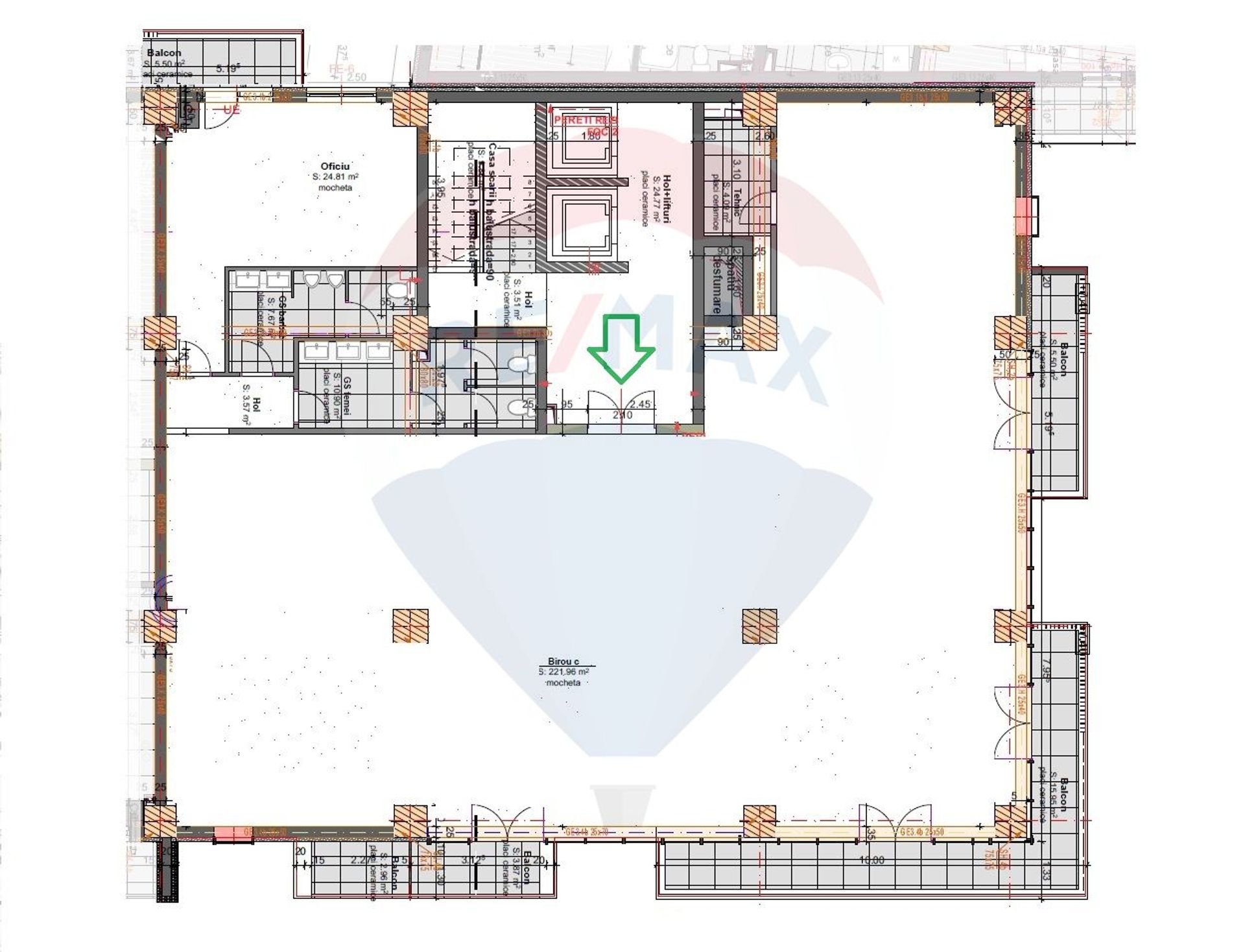 Finisaje: Cortină de sticlă, Ferestre care se deschid, Grupuri sanitare amenajate și utilate, Lift cu destinație programată, Mochetă, Podea înălțată