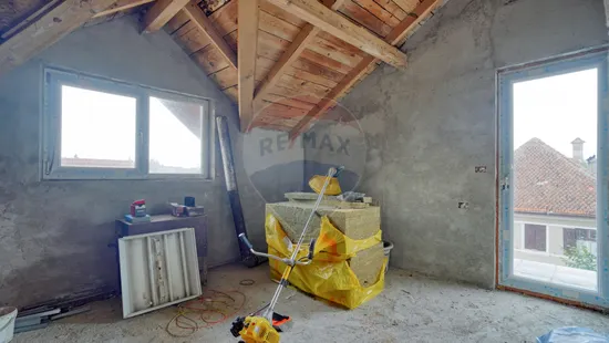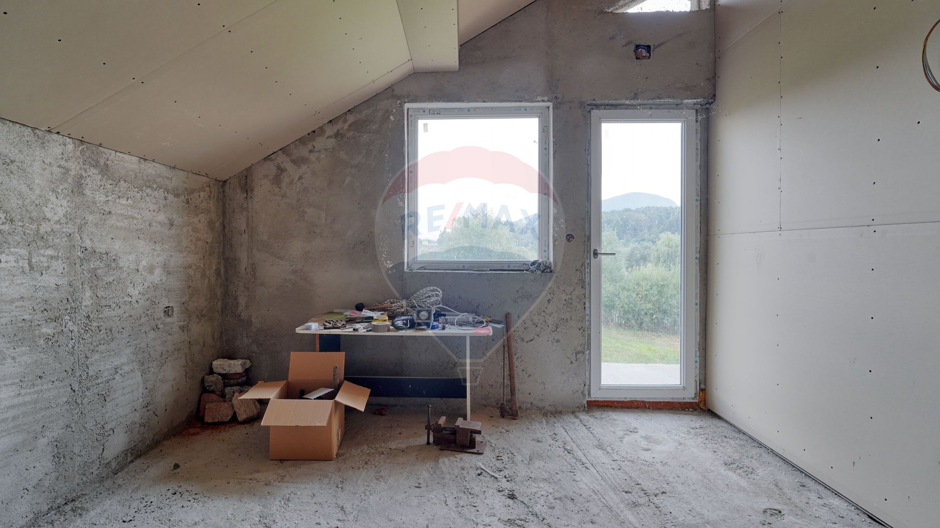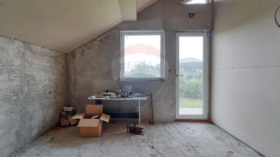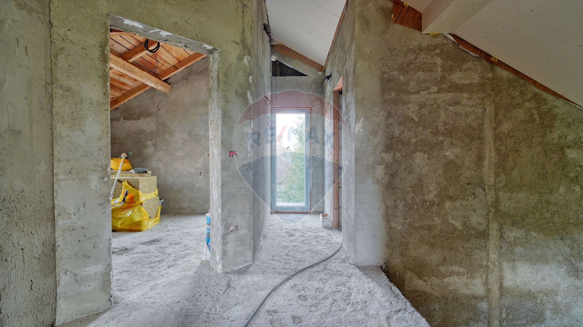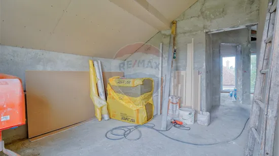 Acum să mergem la etaj, scările au nevoie de finisaje...aveți structura construită doar trebuie să personalizați. La fel și etajul care este compartimentat în 2 camere identice, cu ieșire spre un balcon comun, cu o priveliște...apropo ați văzut turul virtual, acolo veți înțelege despre ce vorbesc. Și da, camerele au fost gândite pentru copii familiei, iar dormitorul matrimonial se află în partea opusă către stradă. Vis a vis de acesta se află și baia de la etaj...tot nefinisată, așteptând amprenta dumneavoastră de a face tot etajul "acasă".