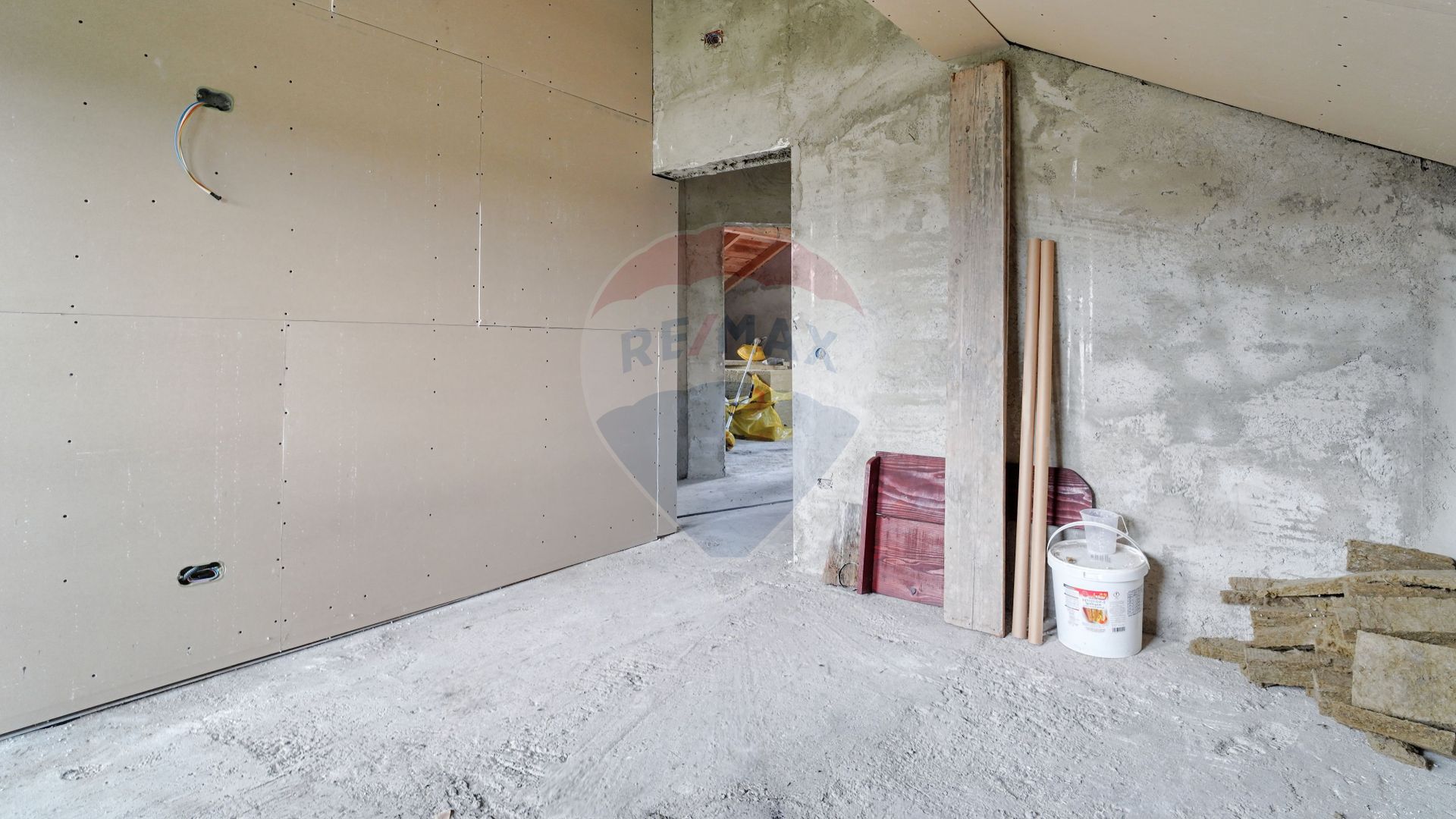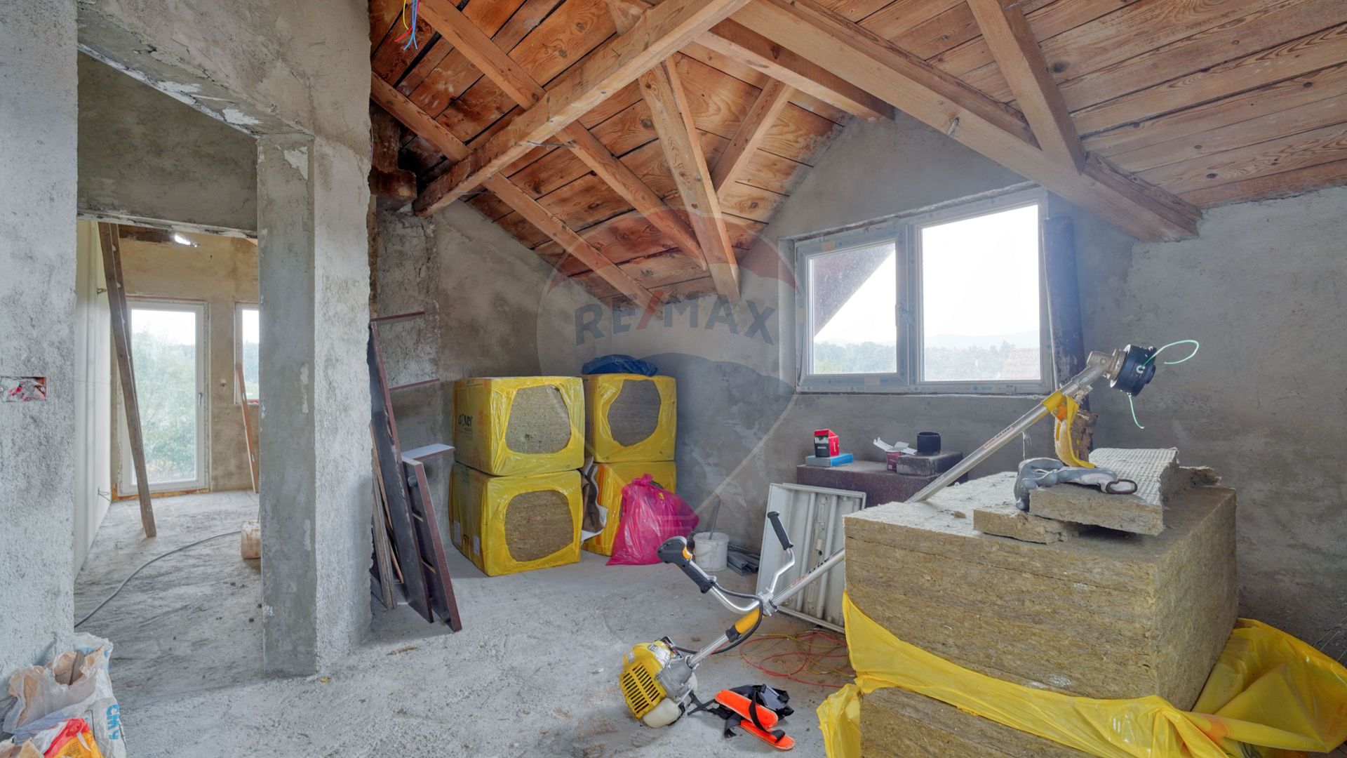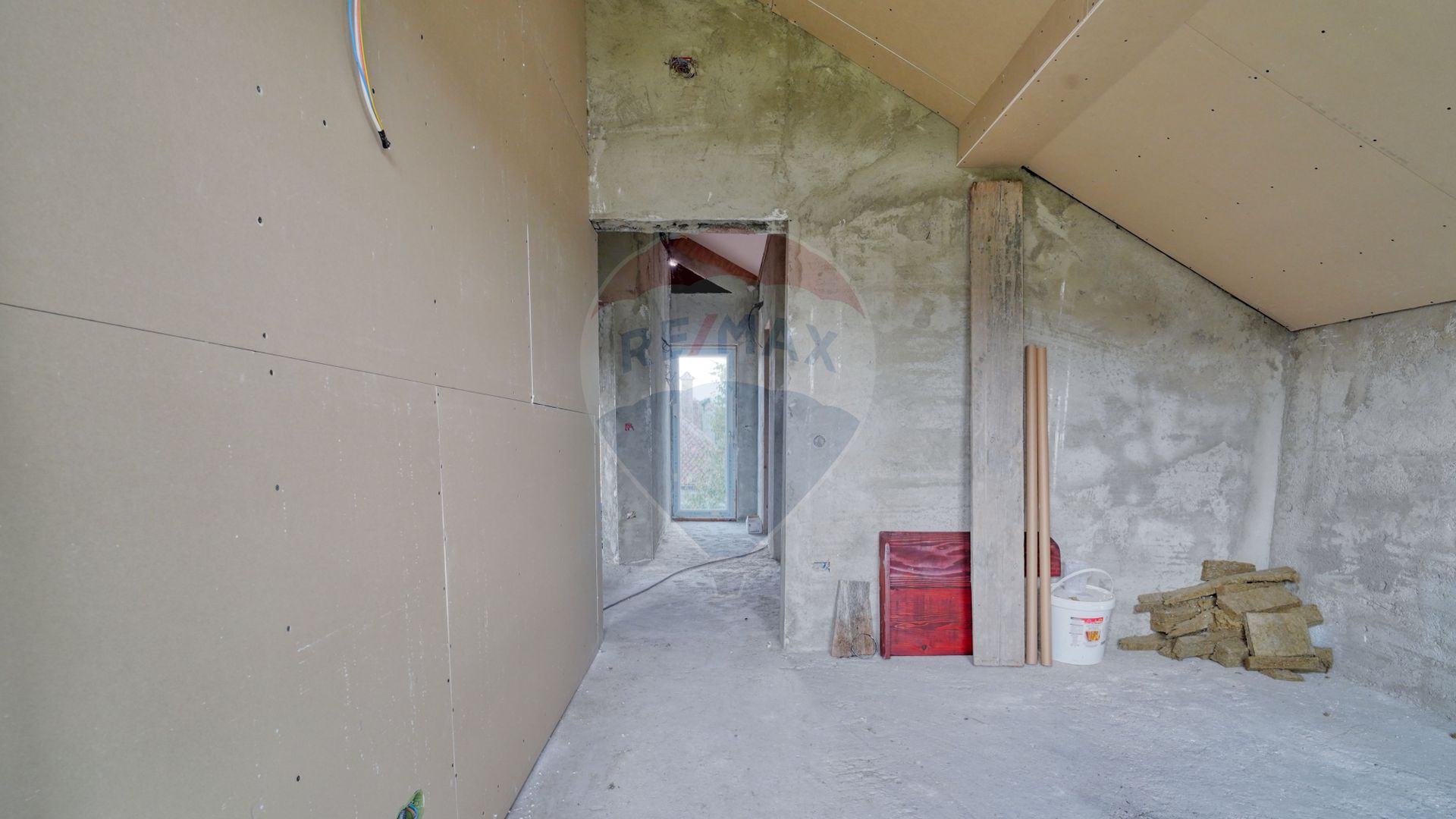 Acum să mergem la etaj, scările au nevoie de finisaje...aveți structura construită doar trebuie să personalizați. La fel și etajul care este compartimentat în 2 camere identice, cu ieșire spre un balcon comun, cu o priveliște...apropo ați văzut turul virtual, acolo veți înțelege despre ce vorbesc. Și da, camerele au fost gândite pentru copii familiei, iar dormitorul matrimonial se află în partea opusă către stradă. Vis a vis de acesta se află și baia de la etaj...tot nefinisată, așteptând amprenta dumneavoastră de a face tot etajul "acasă".