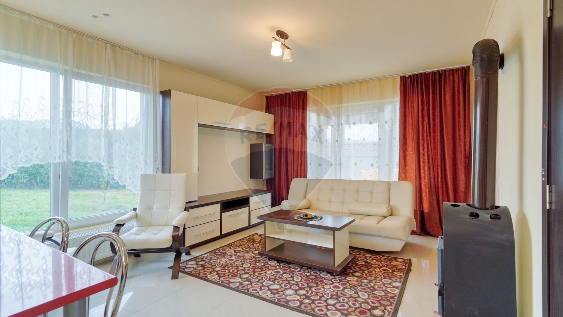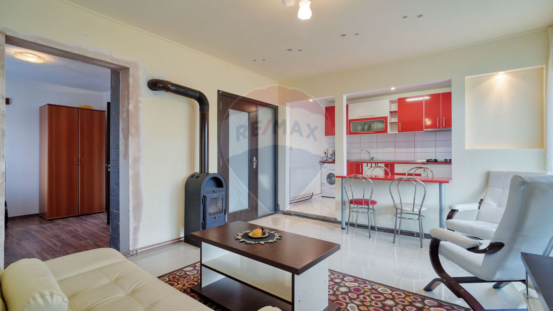 Dar să revenim la casă, arhitectură modernă...două intrări...terasă mai mică la intrarea principală și o terasă mai mare cu ieșire din living...living open space cu bucătăria echipată și mobilată...da poate fi un avantaj. Și imediat observ, sobă de lemne, aaaa îmi aduce aminte de copilărie, iarnă frig afară, iar bunica mai pune un lemn pe foc....da ne aflăm la Vlădeni, la aproximativ 28 kilometri de Brașov.