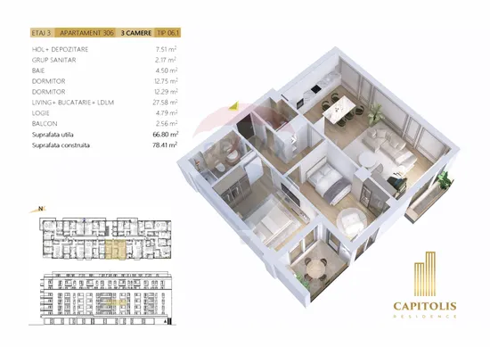 Blocul , cu un regim de înălțime S+P+6E+7R , include 75 de apartamente ce vor fi predate la finalul anului 2026.
