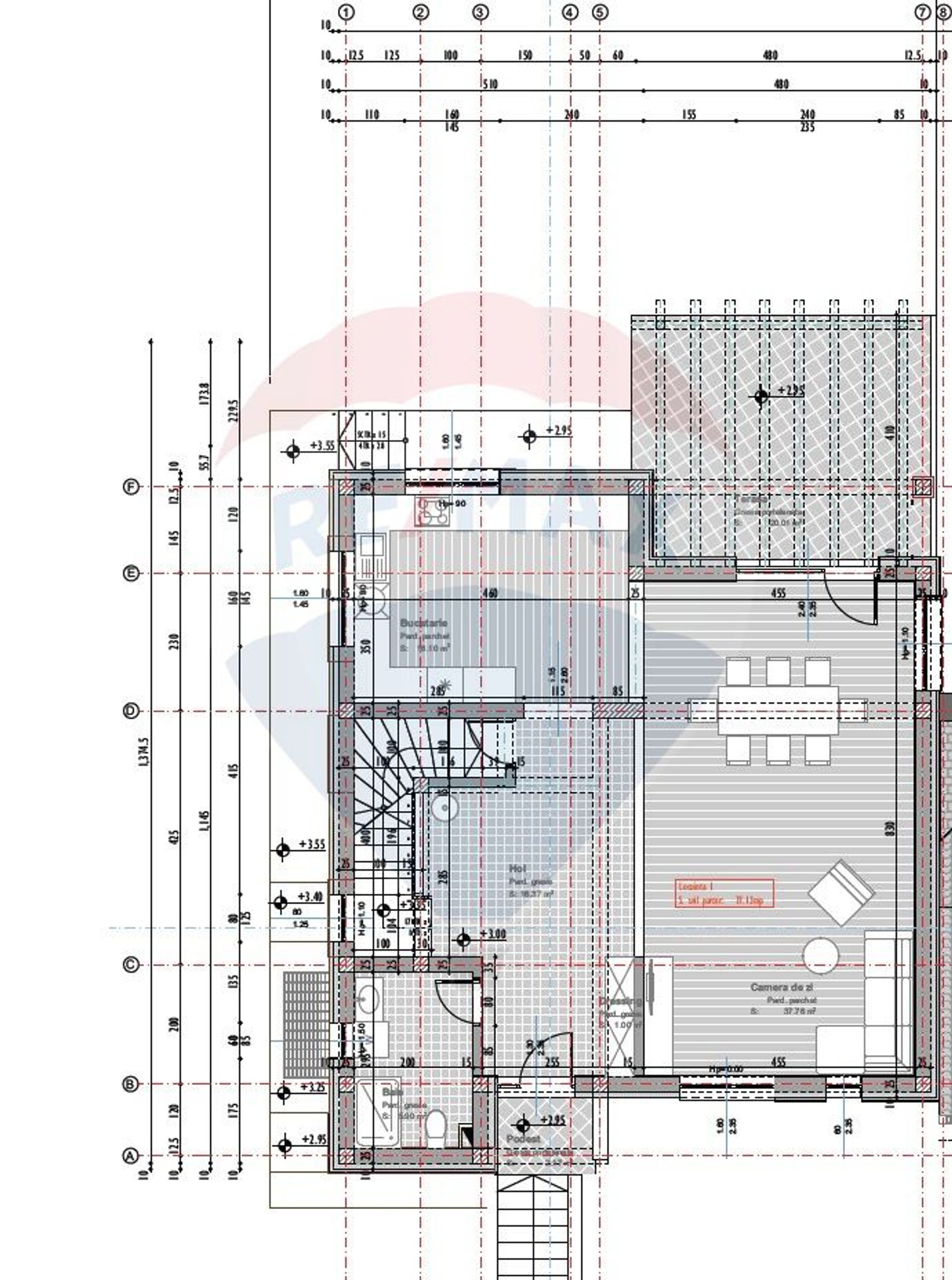 La Parter avem un living generos cu o suprafață de 55 MP, o bucătărie spațioasă de 16 MP, o baie, casa scării și o terasă de 20 MP.