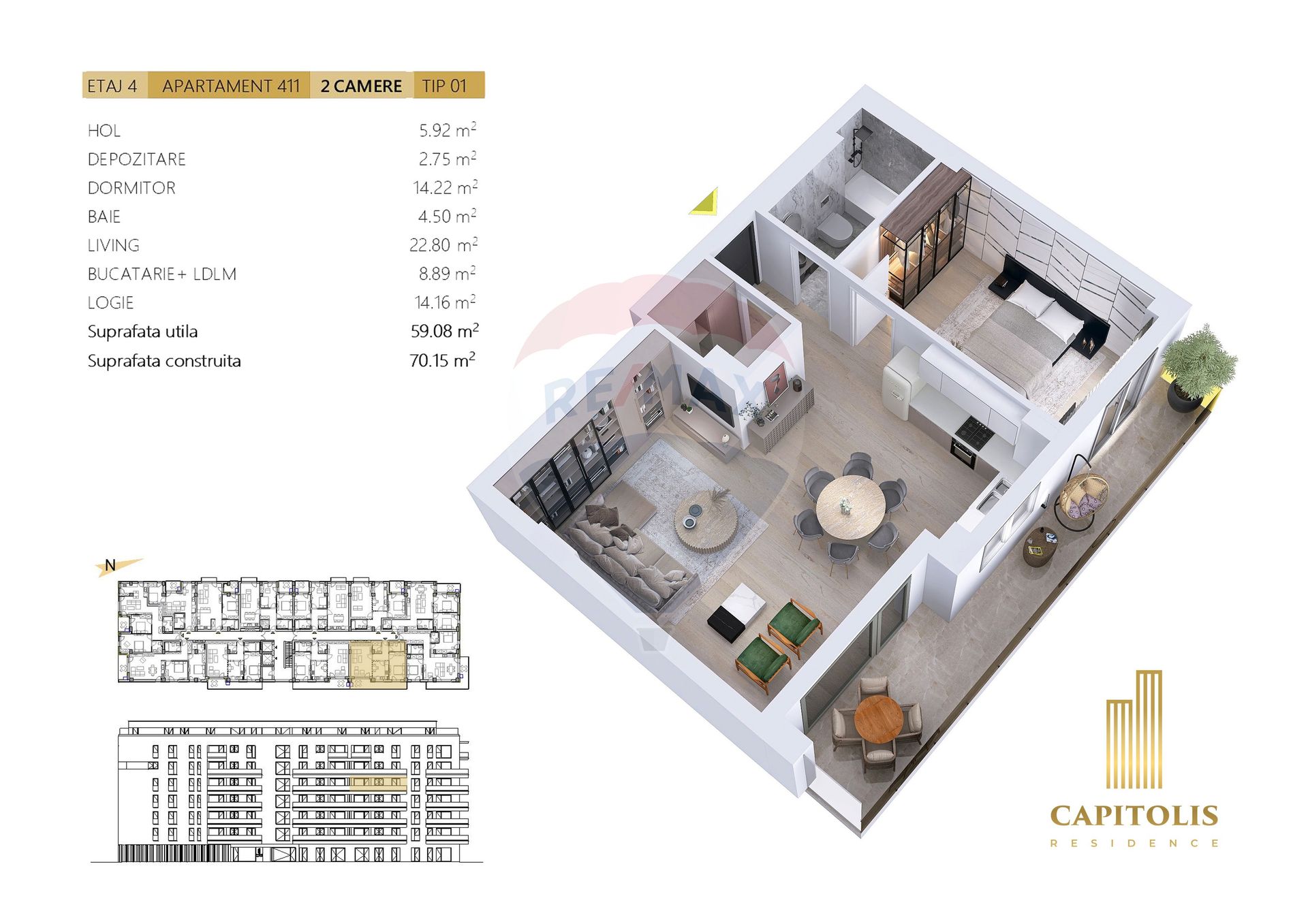 Apartament cu 2 camere, etaj 4, orientare E, Capitolis Residence