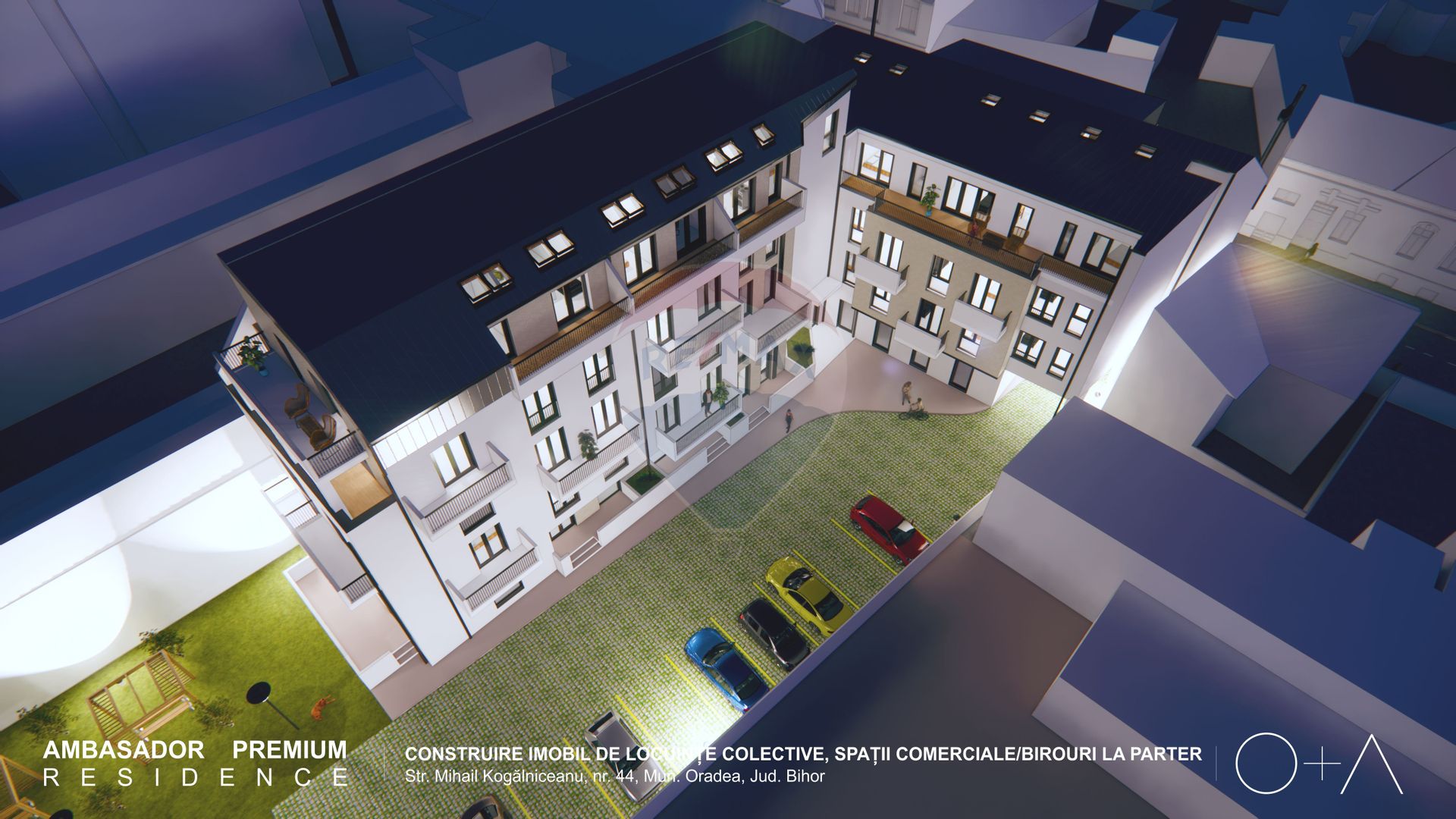 Ansamblul dispune de parcări subterane, care pot fi achiziționate contracost la prețul de 20 000 euro + TVA.