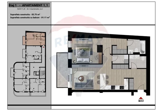 Apartamentul este situat la etajul 1 cu lift al clădirii care dispune de lift și are o suprafațǎ utilǎ de 72 mpu.