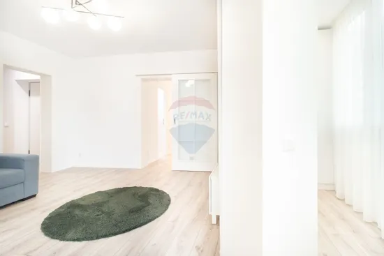 Livingul este echipat cu aer conditionat, TV Smart LG si o canapea expensibila care se poate transforma in pat pentru 3 persoane. Balconul dispus in semicerc este ceea ce ofera unicitate acestui apartament. Fiind dispus pe arcul blocului, livingul are o deschidere vitrata mult mai mare decat apartamentele obisnuite. Din acest motiv s-a renuntat la usile catre balcon, incluzandu-l in spatiul util. Au rezultat doua spatii inalte de depozitare in capetele fostului balcon si o configuratie unica. Spatiul din balcon poate servi drept birou excelent pentru cine lucreaza mult de acasa, avand deschidere catre coroanele copacilor, roacoare vara, fosnet de frunze, ciripit de pasari, lumina naturala.