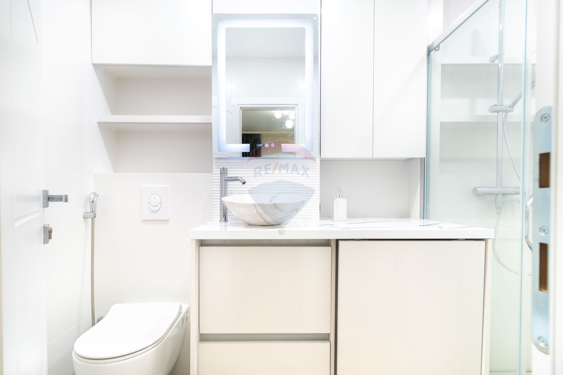 Un alt amanunt care pluseaza la eleganta apartamentului este alegerea usilor. Avem 3 usi in total, toate albe nicuniuna la fel cu cealalta. Cea de acces, metalica, apoi cea care separa livingul de spatiul de noapte, unde s-a optat pentru o usa glisanta, astfel incat daca se doreste separarea spatiului sa se poata face simplu, dar daca se doreste un spatiu deschis, atunci usa sa nu stea in drum, ci sa dispara discret langa perete. Accesul in baie se face direct din dormitor, aici avand singura usa batanta din casa. Baia este echipata cu masina de spalat rufe Samsung Digital Inverter, olginda Smart Touch cu led, baterii Grohe si sanitare Cerastyle. In dormitor gasim si al doilea TV Smart Samsung.