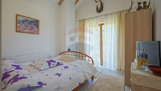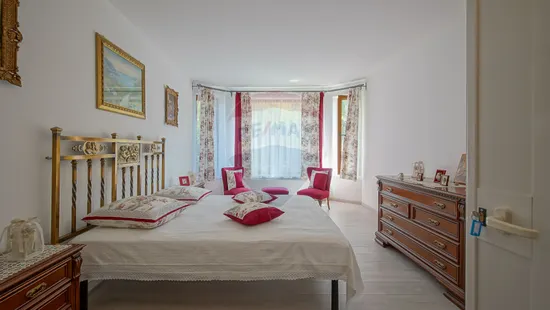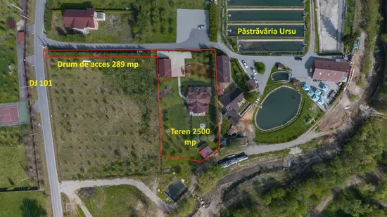 La proprietate se ajunge printr-un drum propriu de acces de 289 m cu o lăţime de 4 m, din DJ 101. Vila este construită în 2006. Există un corp principal cu o amprentă la sol de 160 mp, regim de construcţie subsol parţial de 28 mp, parter de 137 mp cu hol, living open space cu bucătărie, terasă, 2 dormitoare, 1 dressing room, camera centralei, 2 băi; la mansarda de 129 mp utili avem 5 camere, 1 baie, 2 balcoane. Mobilierul şi electrocasnicele nu sunt incluse în preţul afişat. Încălzirea se realizează cu o centrală pe lemne, apa este furnizată dintr-un puţ forat la 63 m adâncime şi există fosă septică.
