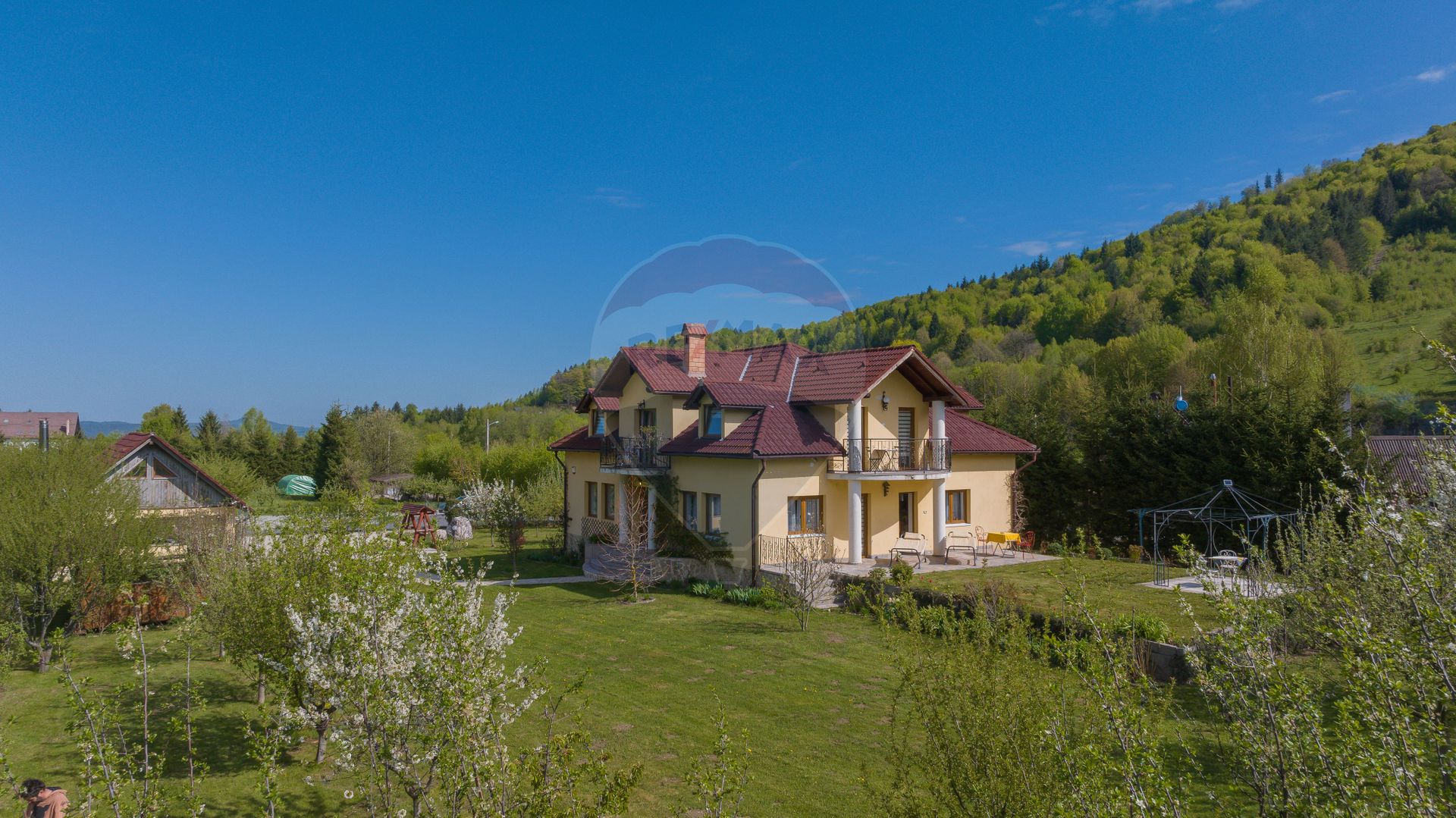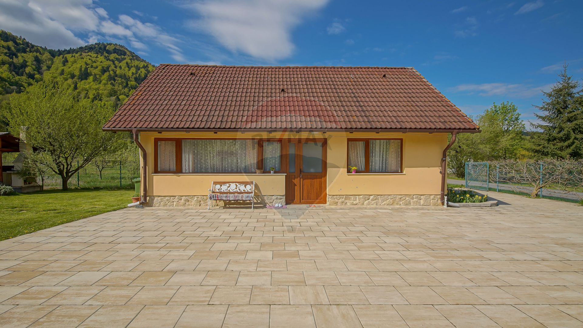 Curtea este amenajată cu alei din piatră naturală, un foișor din lemn masiv perfect pentru mese în aer liber și o zonă de grătar. Din fiecare colț al terasei se deschid priveliști uimitoare către vârfurile muntoase, iar sunetul liniștitor al pădurii creează o atmosferă de relaxare deplină.