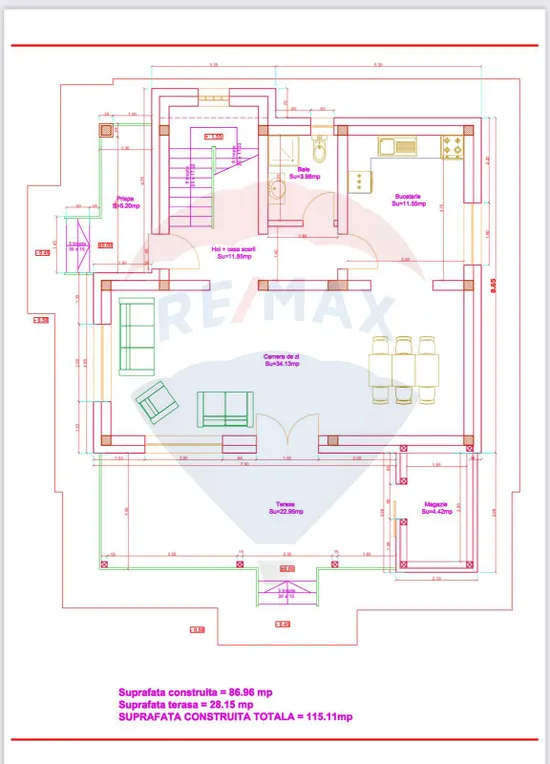 Terasa acoperita (23 mp), terasa intrare (5,5 mp), balcon (7 mp)
