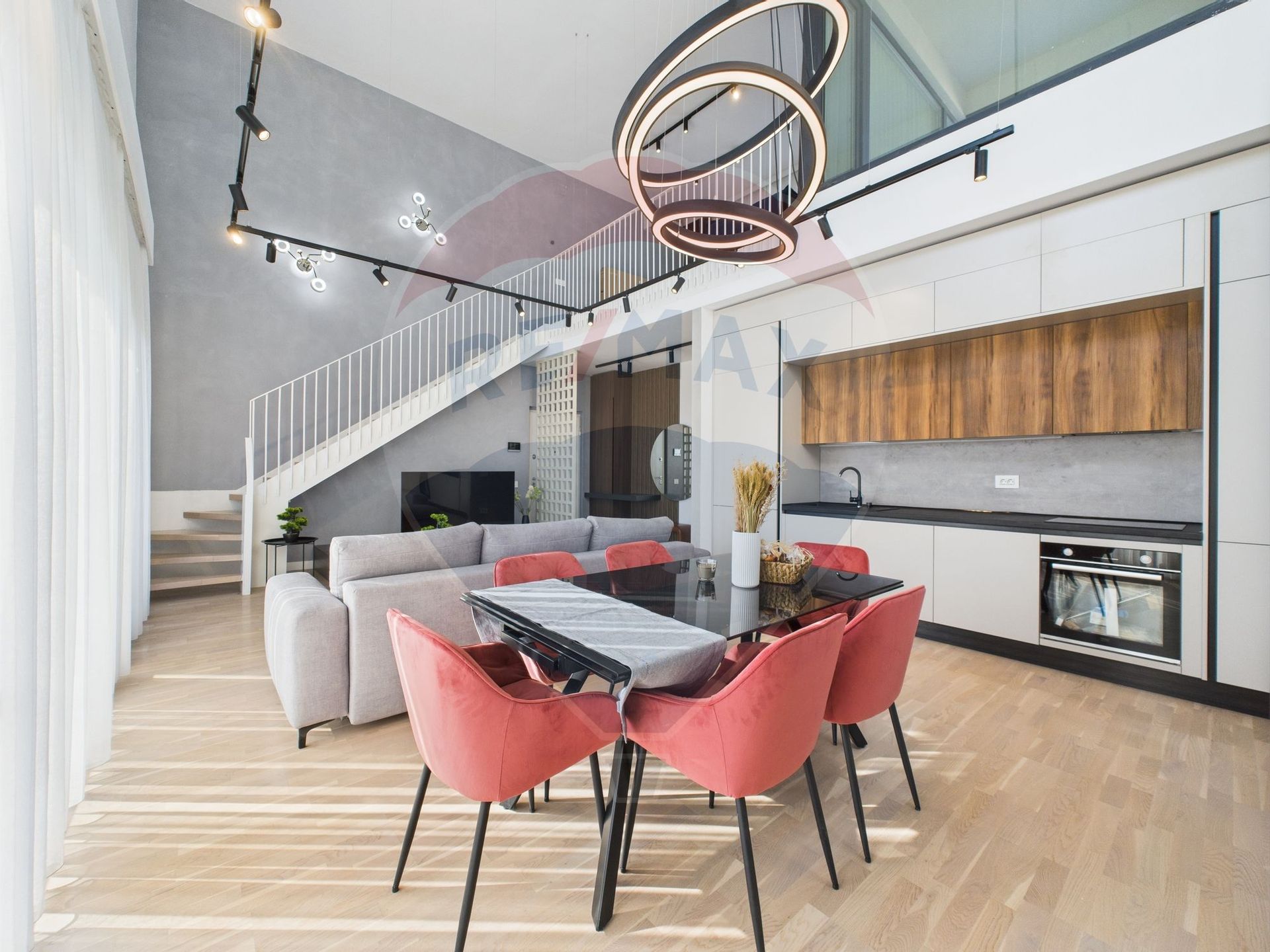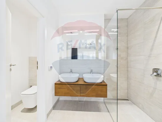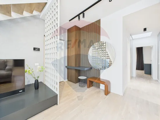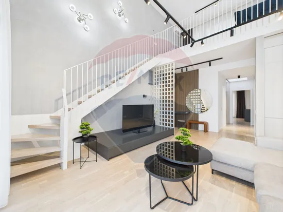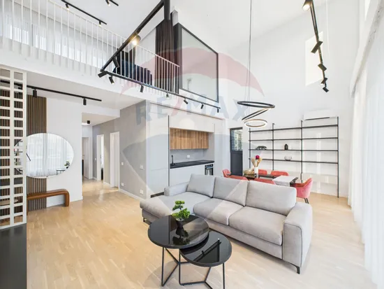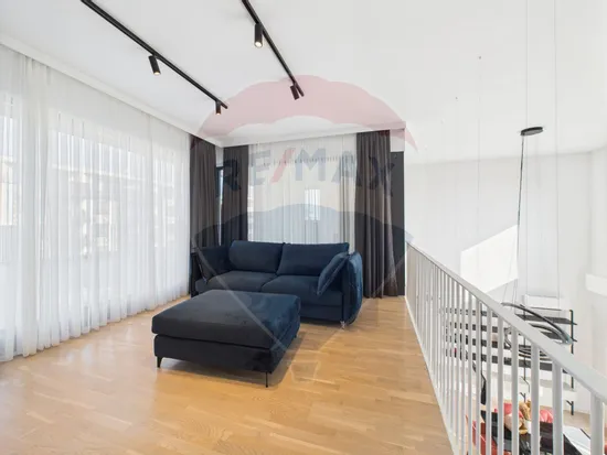 Apartamentul este la prima inchiriere, fiind complet mobilat si utilat. Apartamentul are 2 dormitoare, dintre care unul matrimonial, cu baie proprie. Ambele au acces pe un balcon semideschis cu priveliste catre H Pipera. Holul dintre dormitoare beneficiaza de lumina naturala pe toata perioada zilei datorita unui luminator de 1mp. Zona de zi are o inaltime de aprox 6 metri si cuprinde bucataria deschisa, zona de living si dining, iesirea catre o terasa de 17 mp cu priveliste catre zona verde din interiorul ansamblului si scara catre zona de hobby, construita in stil loft, din care se acceseaza terasa de 50 mp, cireasa de pe tort a acestui apartament. Terasa este impartita in 2 zone: una acoperita, cu acces la apa si energie electrica, si una descoperita, cu priveliste catre H Pipera, perfecta pentru serile cu prietenii sau familia.