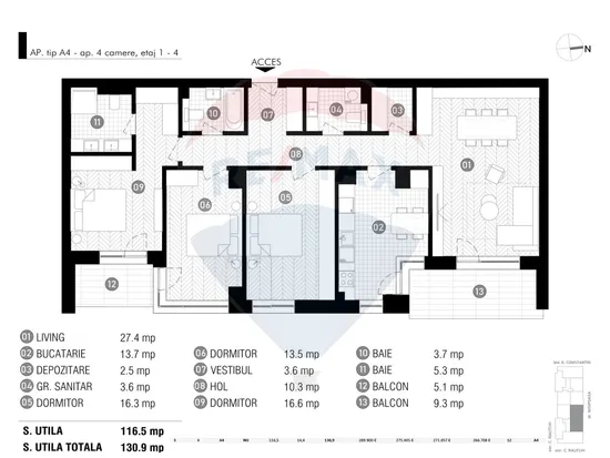 Apartamentul propus se desfasoara pe o suprafata utila de 116,5 mp la care se adauga 2 balcoane cu suprafata de 14,4 mp. Dispune de camere mari si luminoase si o compartimentare eficienta: