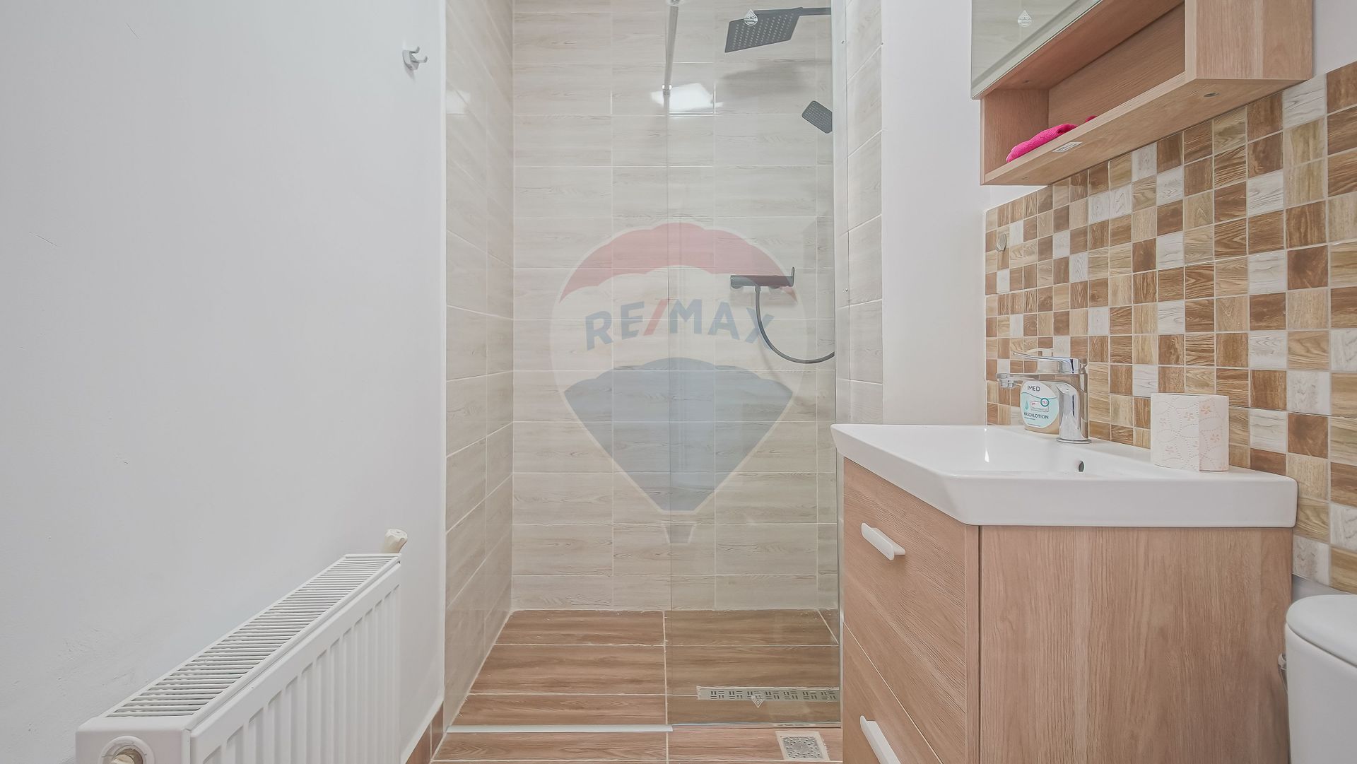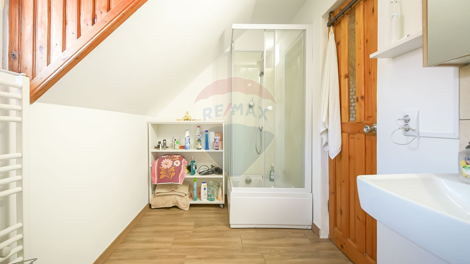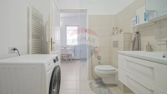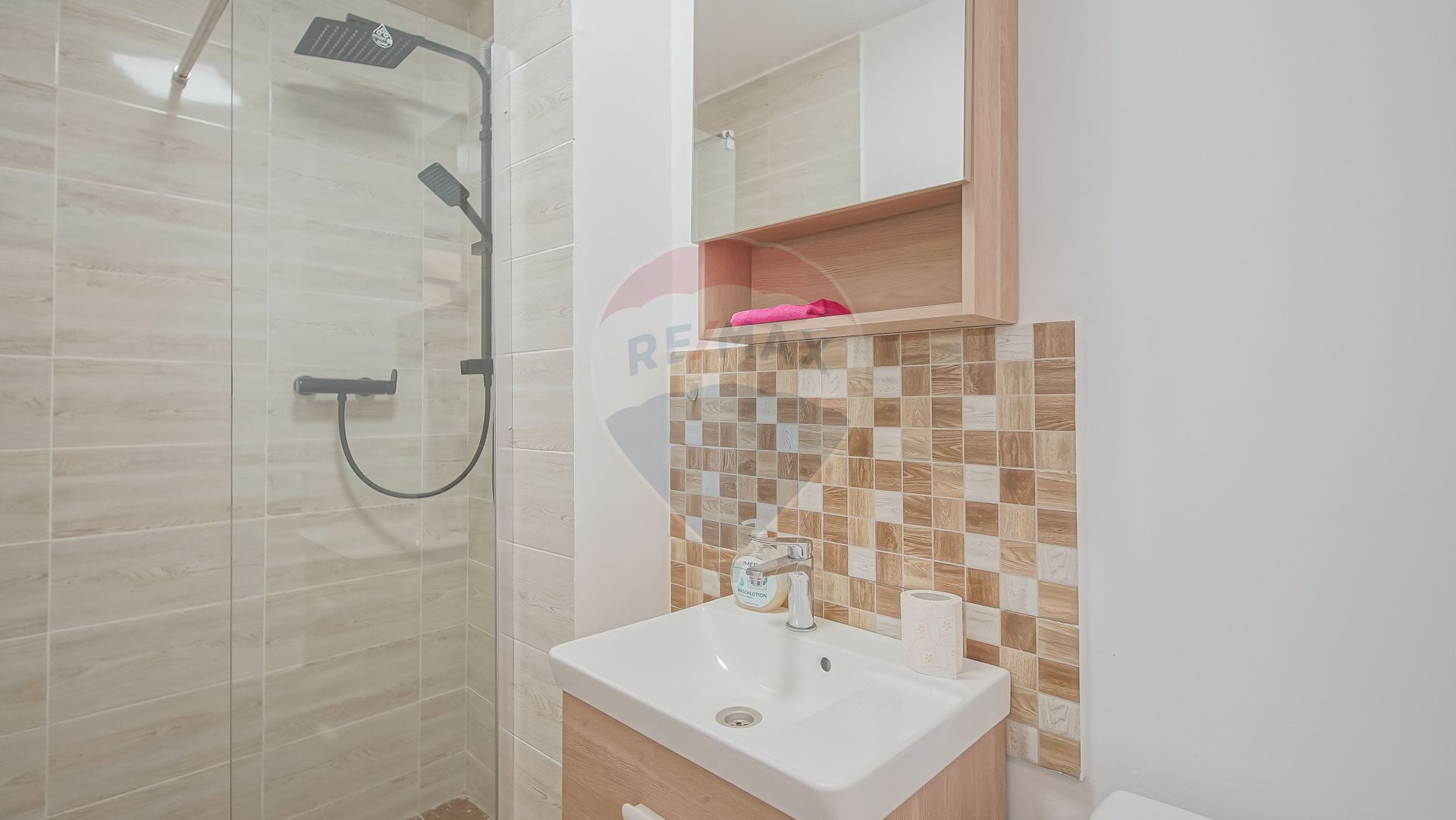Baia de la parter e și ea specială: modernă, cu un duș cu funcție de masaj, care o să-ți prindă tare bine după o zi lungă.