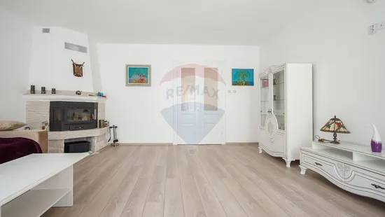 Parterul de 78 mp utili cuprinde un living living mare, scăldat de lumină, de 30 mp utili, cu ferestre generoase care lasă soarele să umple tot spațiul. E genul de cameră unde îți și vezi copiii jucându-se pe covor, și serile liniștite lângă șemineul pe lemne.
