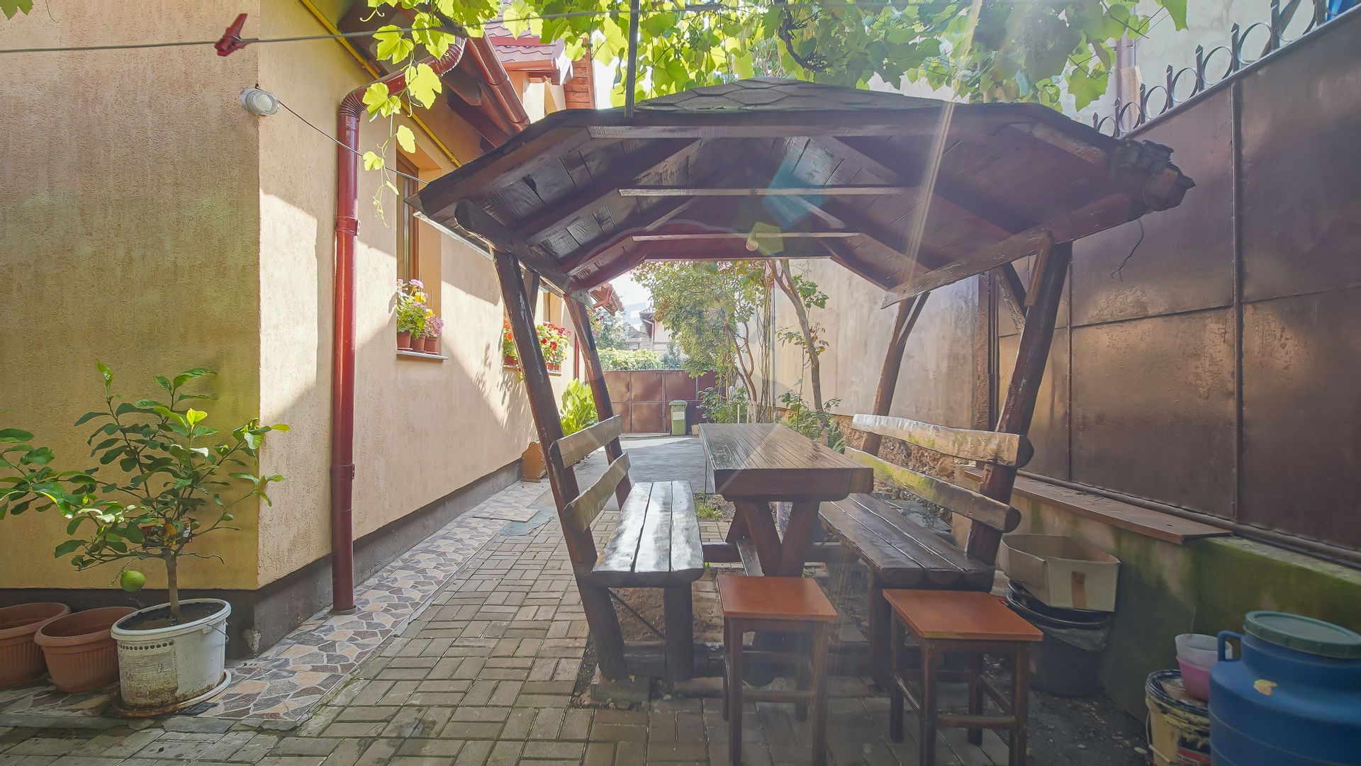 Curtea, deși nu foarte mare, permite parcarea unui autoturism și mai lasă loc pentru o zonă de relaxare, grătar, spațiu de joacă etc.