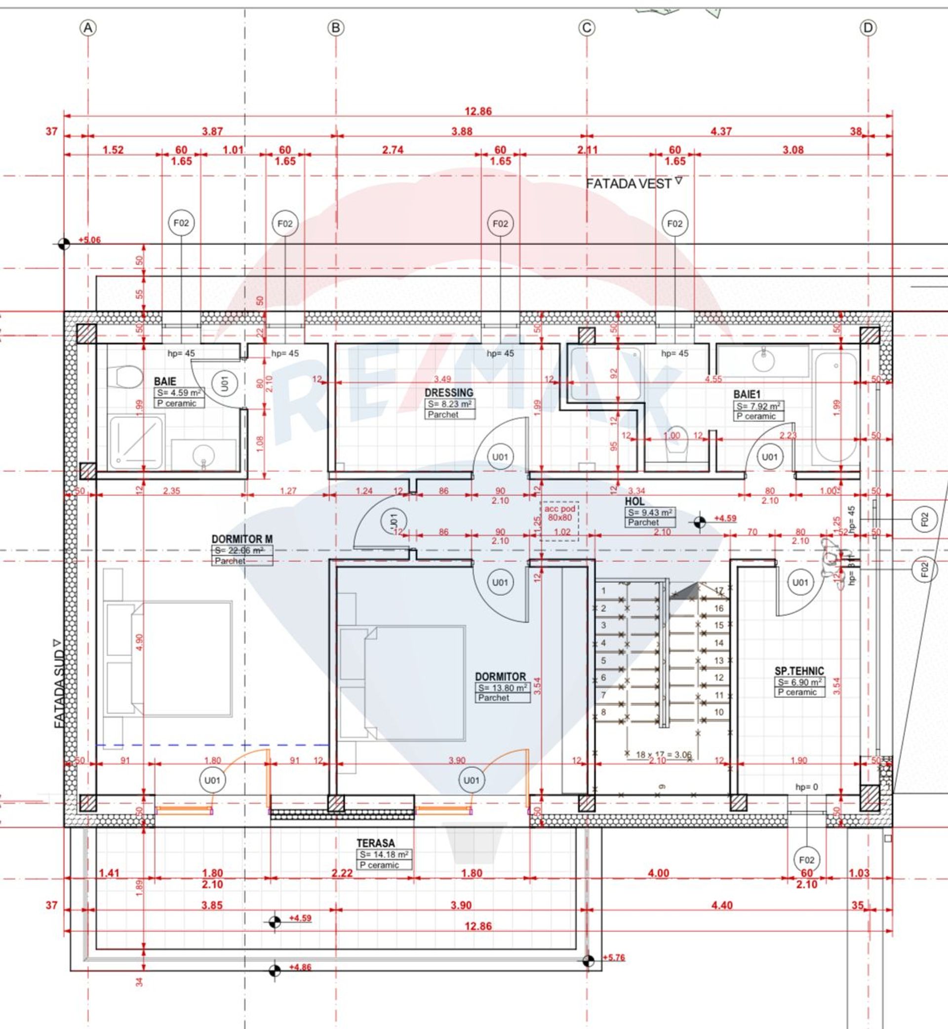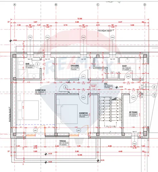 La etaj avem doua dormitoare din care unul matrimonial cu baie proprie (ambele au acces la o terasa de 14mp cu view superb), un dressing, baie si spatiu tehnic.