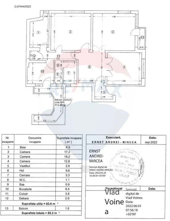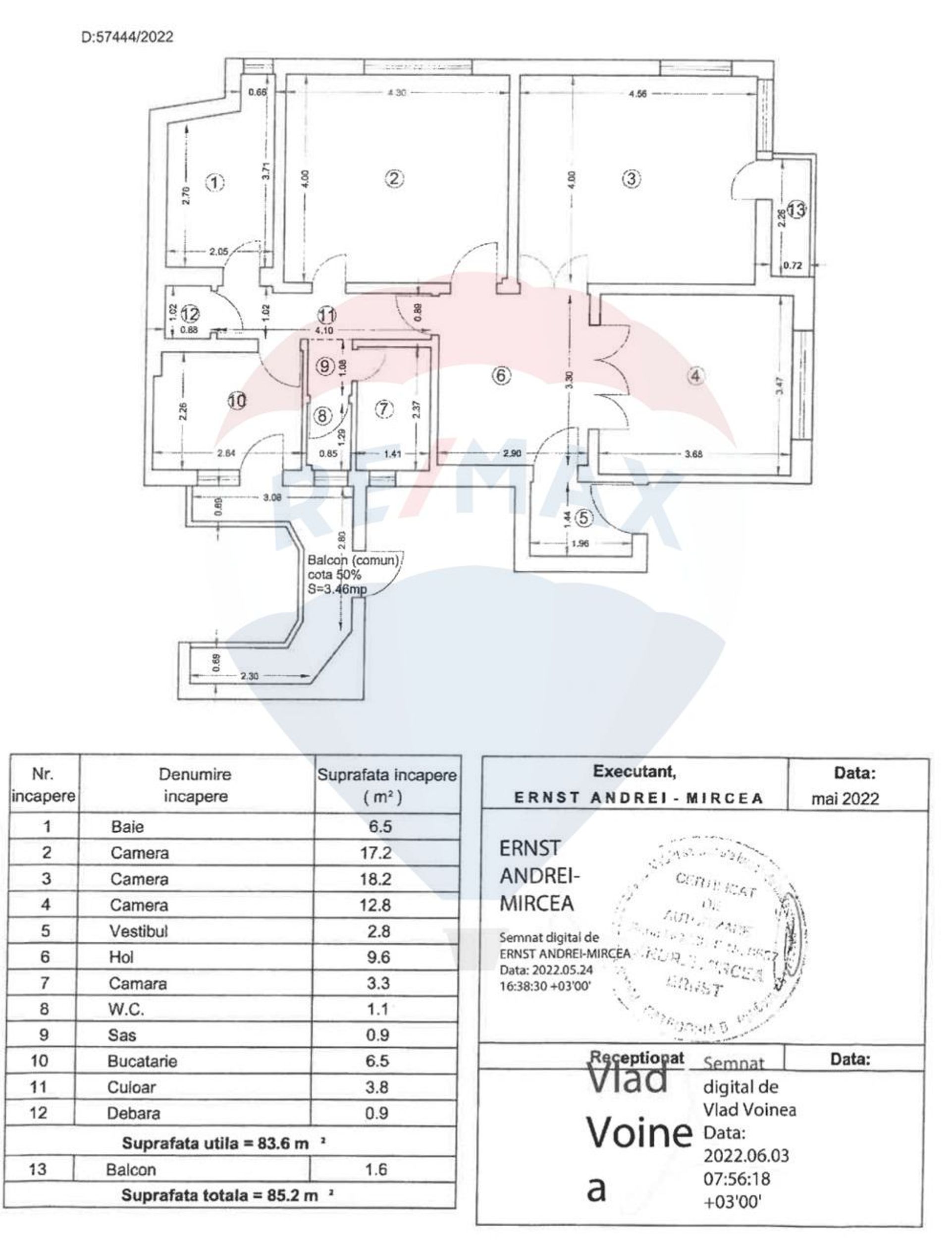 Suprafața totală: 85,2 mp, cu balcon inclus.