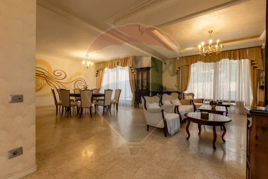 Zona de zi, alcatuita din livingroom spectaculos, mobilat clasic și elegant, cu șemineu și spațiu generos pentru relaxare.
