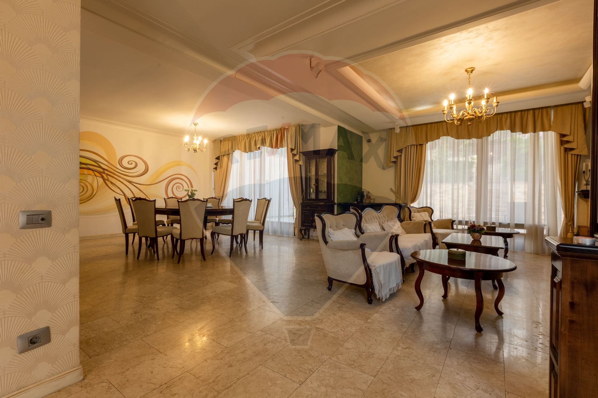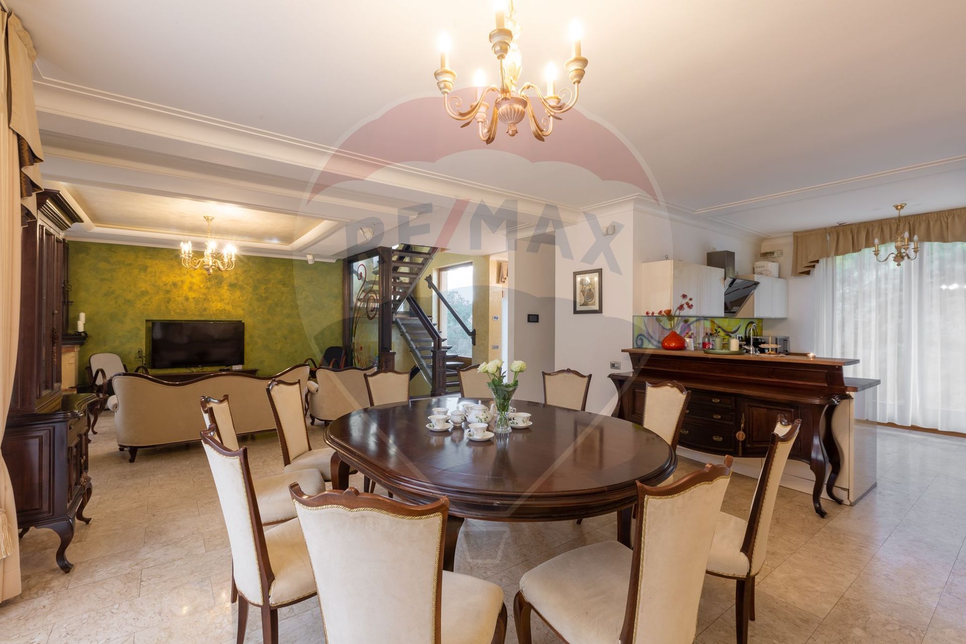 Dining impunător, cu masă mare pentru reuniuni de familie sau întâlniri oficiale.
