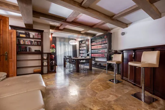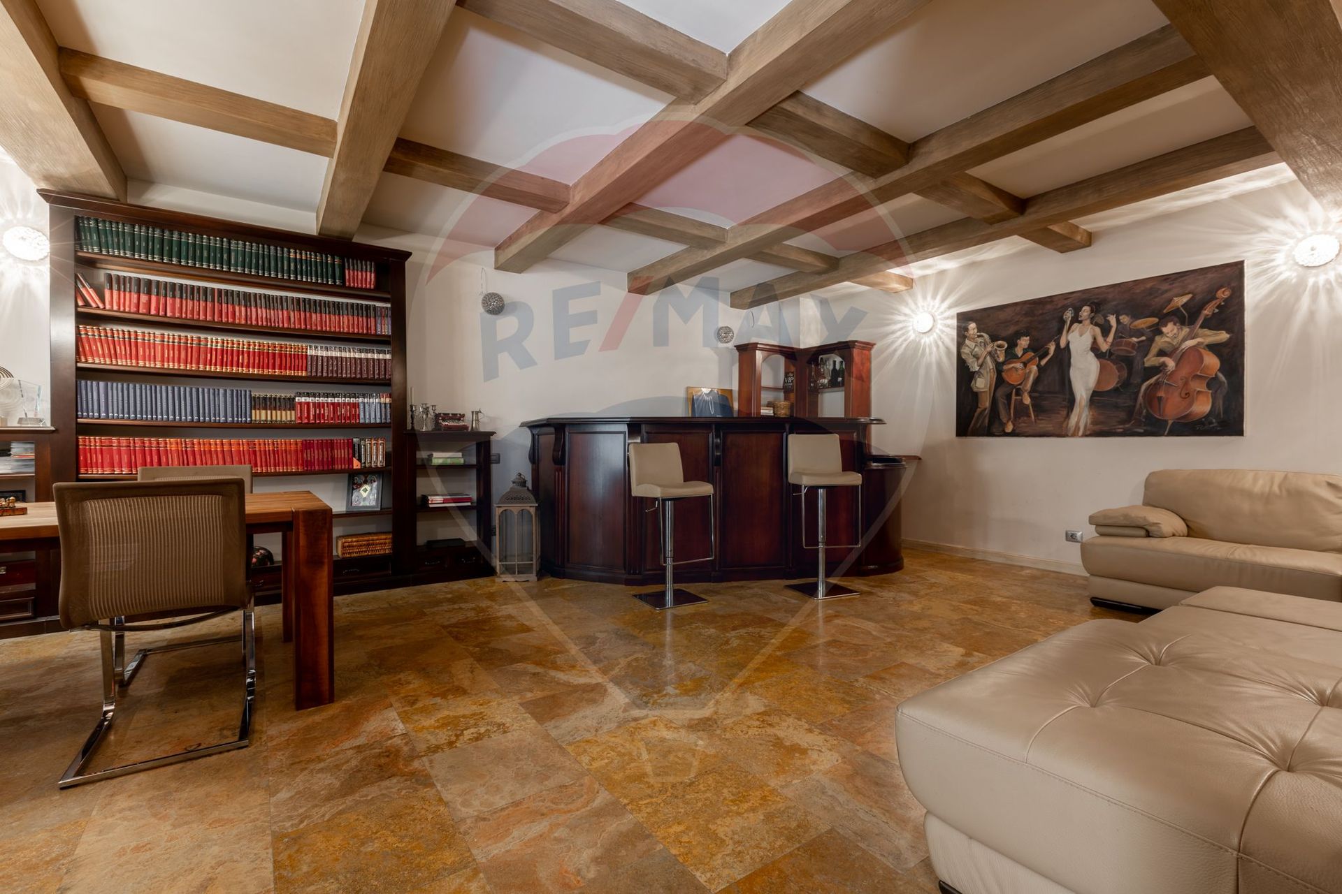 Hobby & relaxare - un etaj dedicat recreerii, compus dintr-o incapere generoasa dotata cu un bar din lemn masiv, bibliotecă generoasă, zona de relaxare sau petreceri, cu acces direct la terasa cu iarbă, pardoseli din piatră naturală.