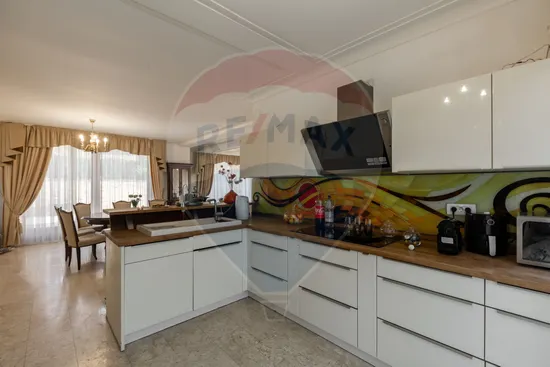 Bucătărie modernă, mobilată și utilată cu electrocasnice premium importate din Germania, cu design artistic. Pardoseli din marmură și piatră naturală