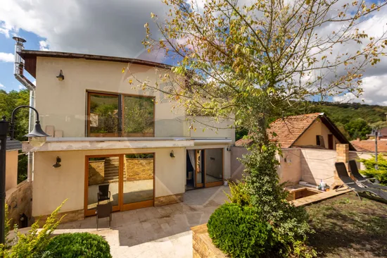 Curte în trepte, cu vegetație și multă intimitate, priveliște directă către pădure și aer curat.