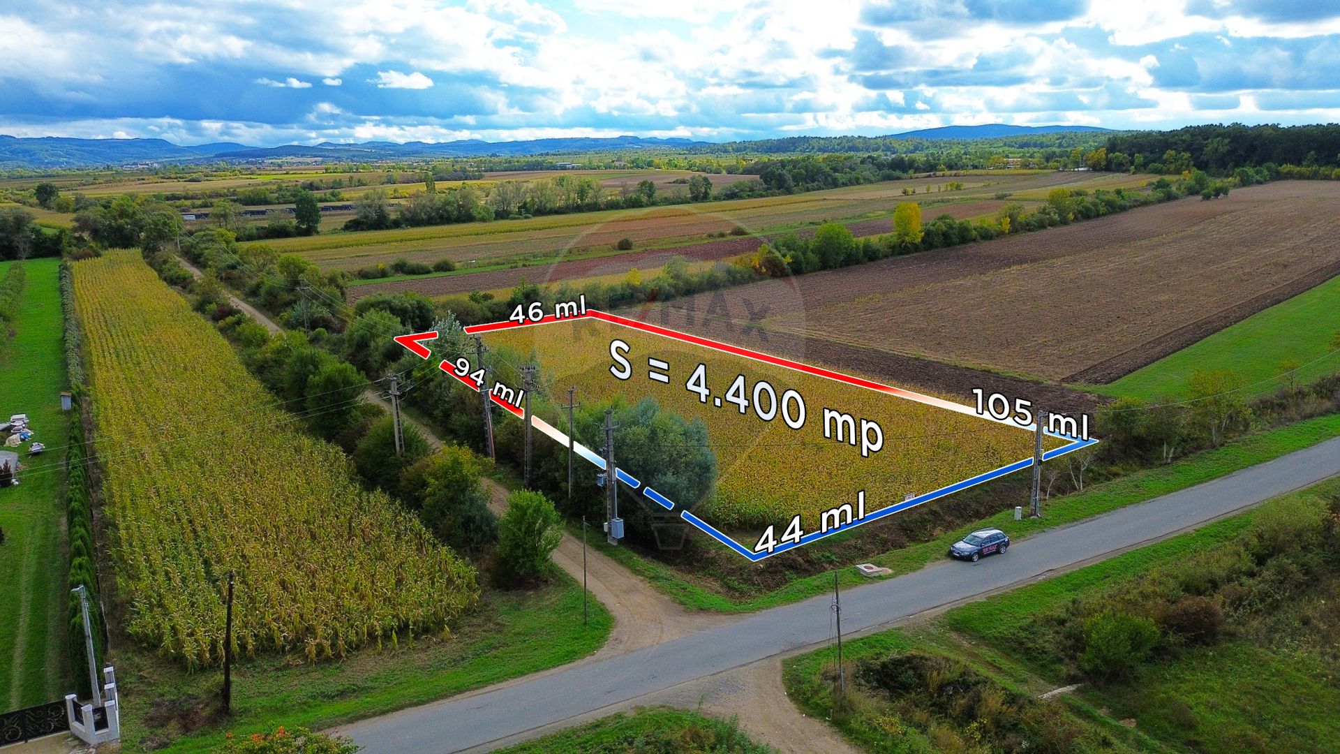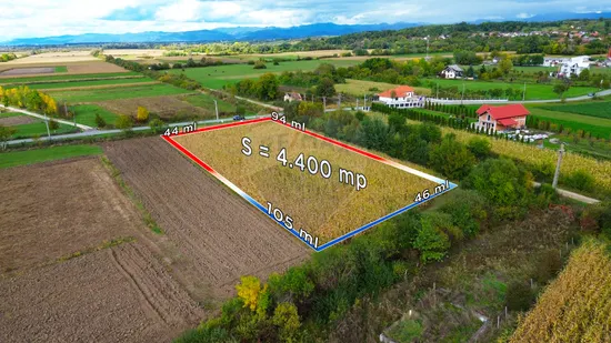 Terenul are formă regulată și este ideal pentru construcții rezidențiale. Suprafața totală este de 4.400 mp, cu posibilitatea achiziționării unei parcele de 2.200 mp.