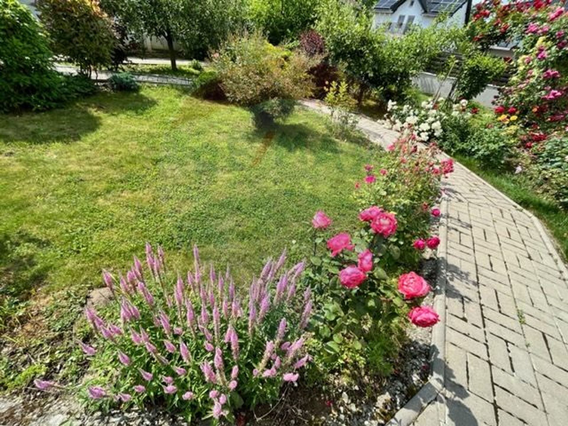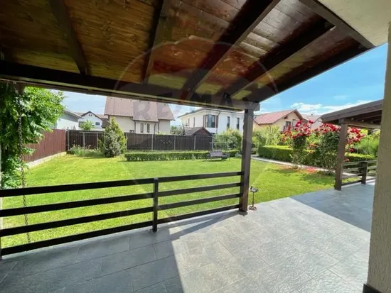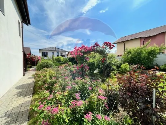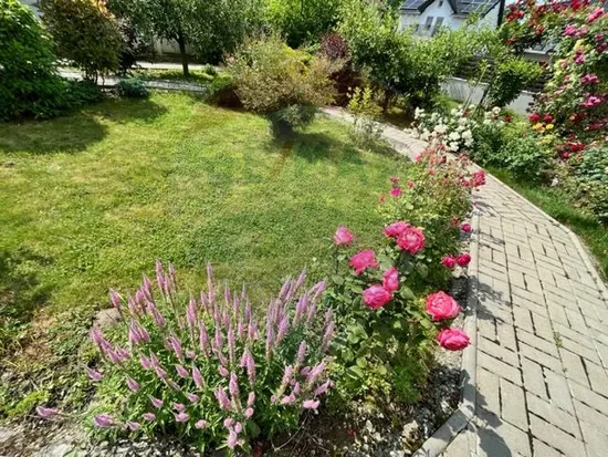 Curte: Amenajată cu gazon verde, flori variate și arbuști decorativi.