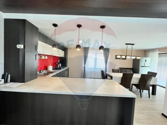 Bucătărie open space, complet utilată, cu ieșire pe o altă terasă.