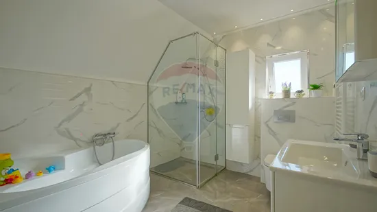 Construită în 2021, casa îmbină armonios modernul cu funcționalitatea. La parter, livingul spațios și zona de dining devin centrul vieții de familie, bucătăria separată cu cămară este locul unde se pregătesc cele mai bune rețete, iar garajul integrat adaugă un plus de confort. La etaj, cele trei dormitoare primitoare, baia cu cadă și balconul te invită la relaxare și momente de liniște.