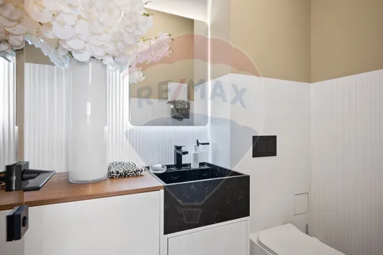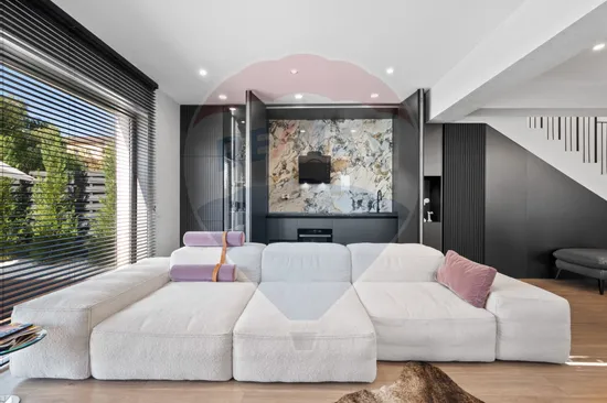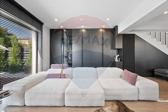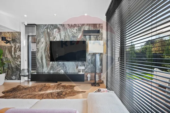 Toate camerele au un tavan inalt, de peste 2.90 m, conturand un spatiu generos, aerisit, interiorul purtand semnatura unui designer cu o viziune moderna, completata de utilizarea celor mai noi tendinte in design si tehnologie. Finisajele si mobilierul sunt din gama premium (Natuzzi/ Rovere/ Divanissimi etc), vila avand o terasa generoasa din deck, ce ofera o priveliste superba spre curtea interioara, amenajata de peisagist, ce ofera intimidate si o oaza de liniste.