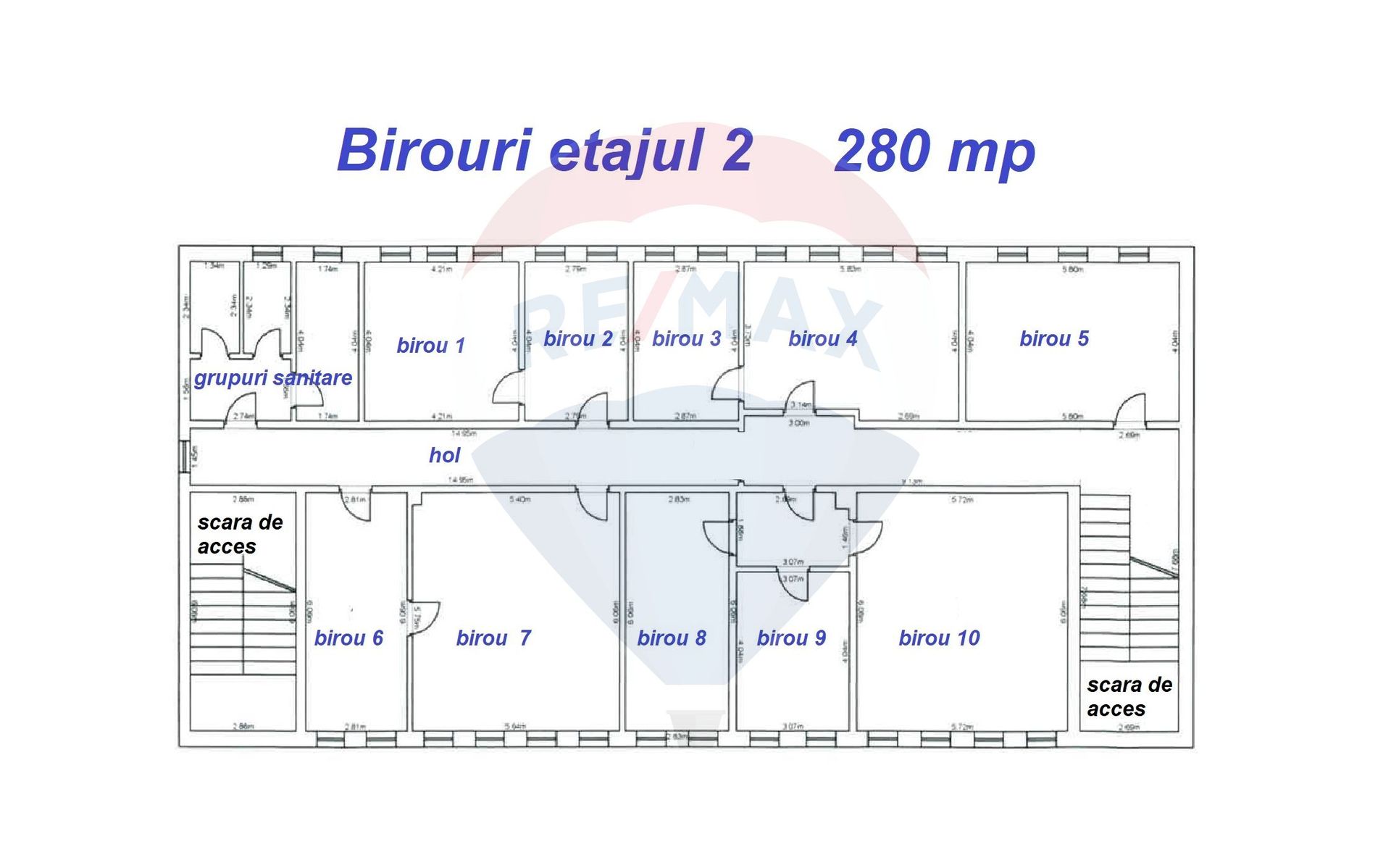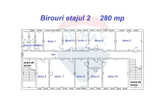 • Compartimentare: Decomandată, incluzând 10 birouri, un hol central, scări pe ambele laturi ale spațiului și grupuri sanitare separate pentru bărbați și femei.