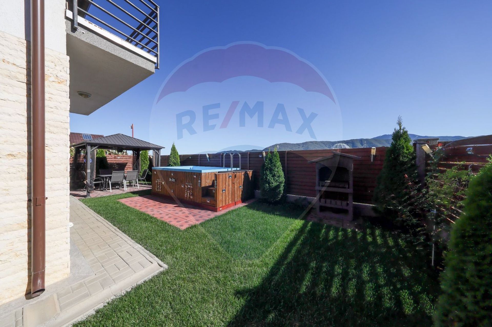 -Curte complet amenajată, gazon întreținut, arbori ornamentali, zonă de grătar;