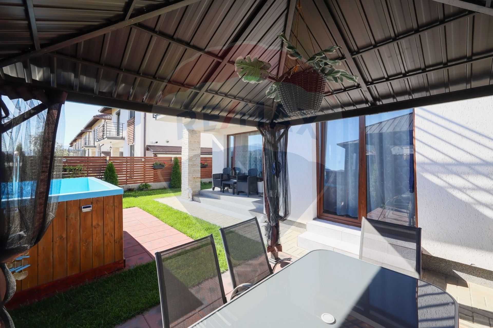 -Piscină supraterană finisată cu lemn, acces pe scări, ideală pentru relaxare în familie sau cu prietenii;