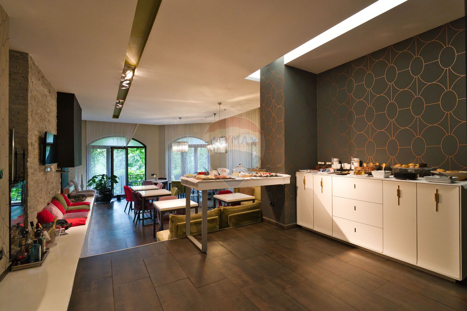 • Pereți: Piatră naturală, Tapet, Vopsea lavabilă