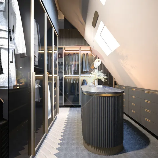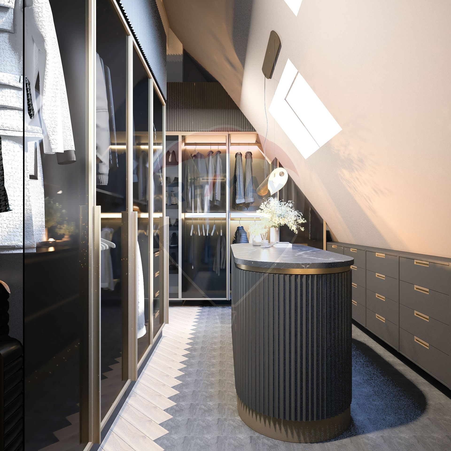 La nivelul superior avem 3 dormitoare: o suita matrimoniala de aproape 41 mp cu baie proprie si dressing imens si acces catre terasa proprie de aproape 20 mp, un al doilea dormitor de aproape 18 mp si unul mai mic, de 15 mp care poate fi poate fi o camera ideala pentru copii, fiind situat pe partea boltita a tavanului foarte inalt. In punctul cel mai inalt tavanul are 3.5m inatime, spatiul fiind unic din acest punct de vedere. S-a dorit obtinerea unor incinte non standard, care sa satisfaca nevoile acelor clienti care vor sa iasa din norme si sa aiba o casa unicat. Tot aici la nivelul superior mai avem si o baie secundara.