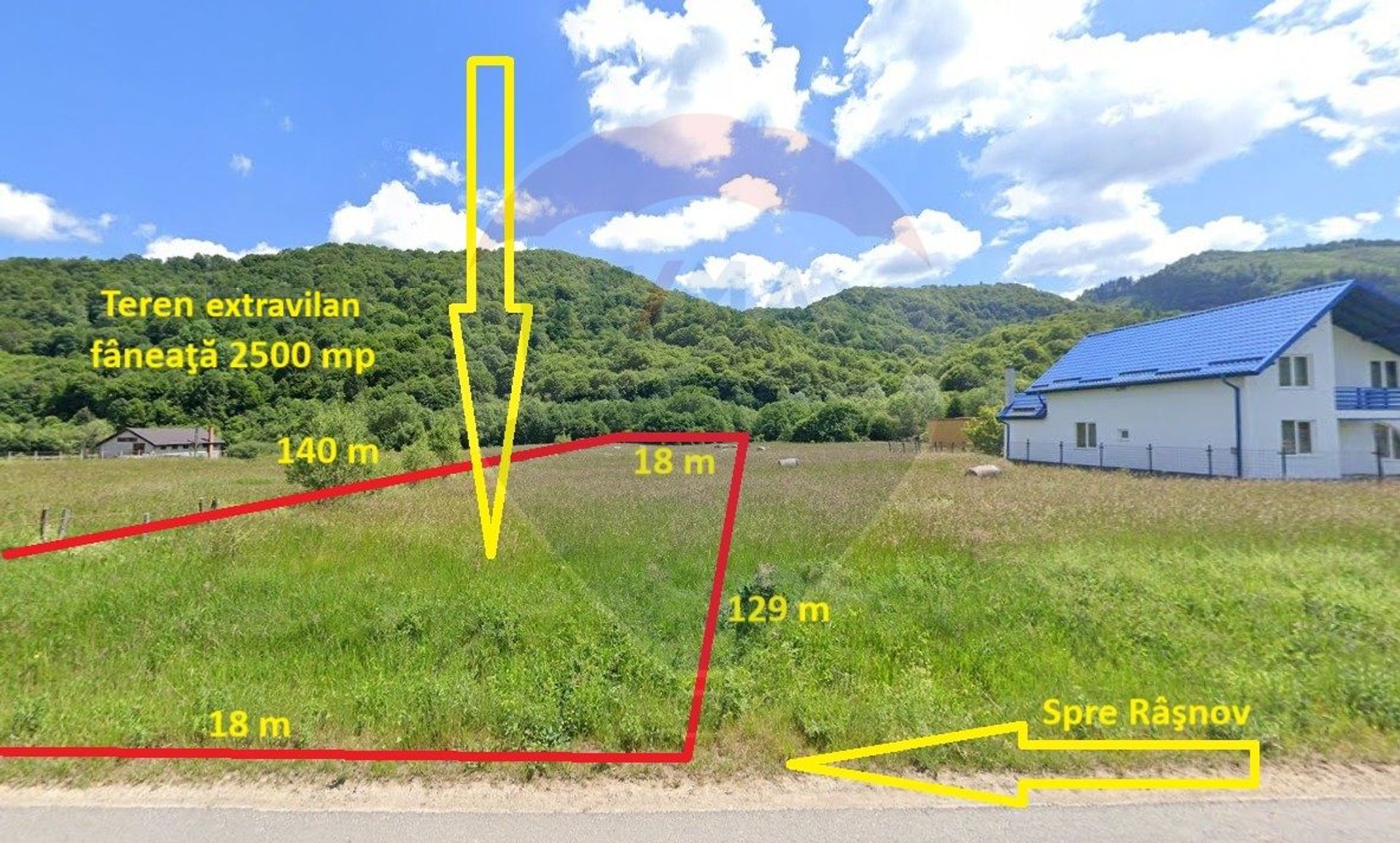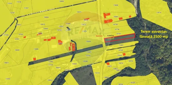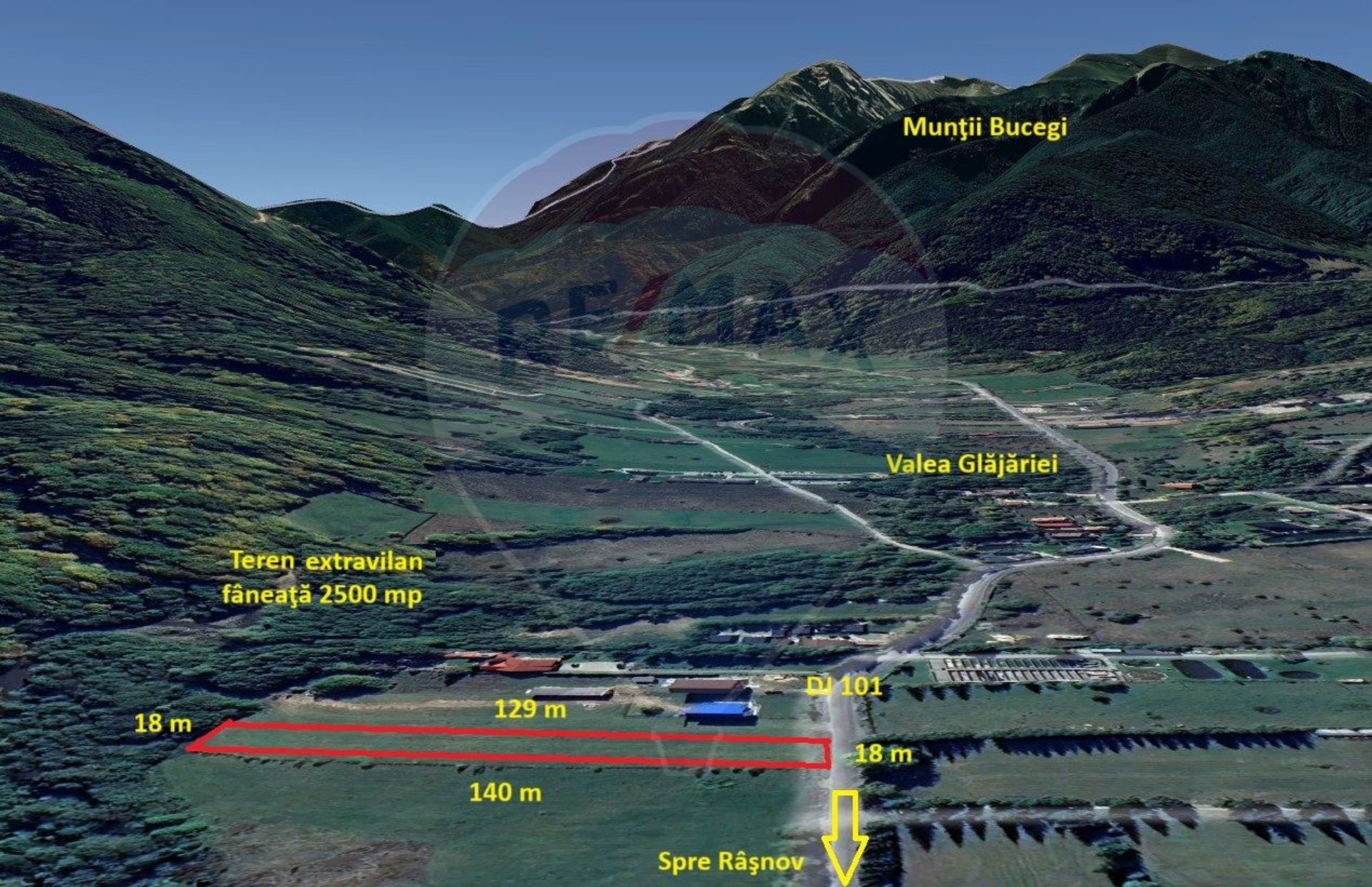 Teren extravilan, fâneaţă, 2500 mp, front 18 m, adâncime 140 m. Curentul este la teren. Zona Glăjărie este una dintre cele mai căutate zone pentru turism montan și locuințe de vacanță. Accesul se face din DJ 101, asfaltat, la doar câteva minute de centrul orașului Râșnov și la 15 km de Bran sau Poiana Brașov. Panorama este superbă către Munții Bucegi și Piatra Craiului. Zonă ideală pentru construcția de case de vacanță, cabane turistice, investiții în regim hotelier (Airbnb, booking).