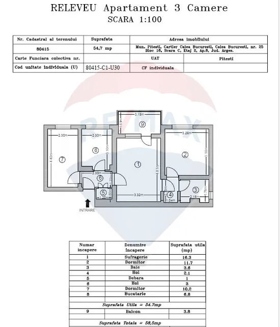 58,5mp utili, compartimentare semidecomandată (living, 2 dormitoare, bucătărie, 1 baie, balcon) .