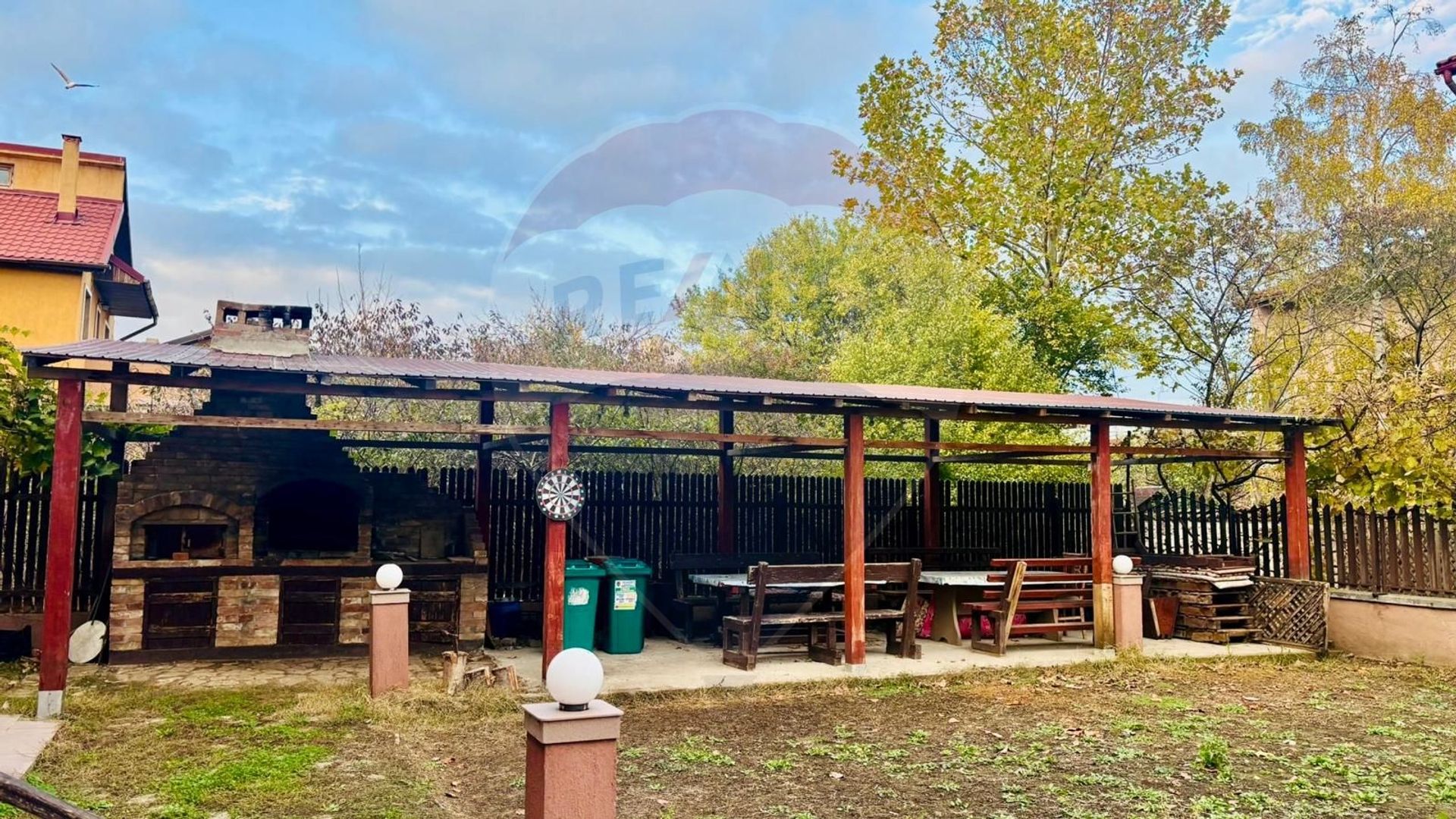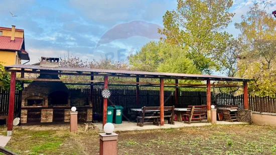 Curte frumos amenajată, foișor, zonă de grătar și grădină cu flori.