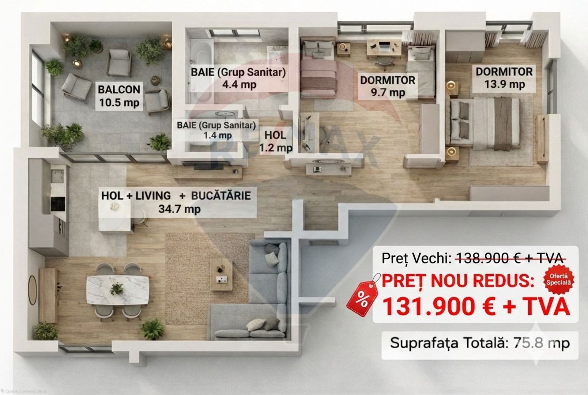 - Suprafata utila totala a apartamentului este de 75,8 mp compusa din apartament 65,3 mp + terasă semi-acoperită de 10,5 mp