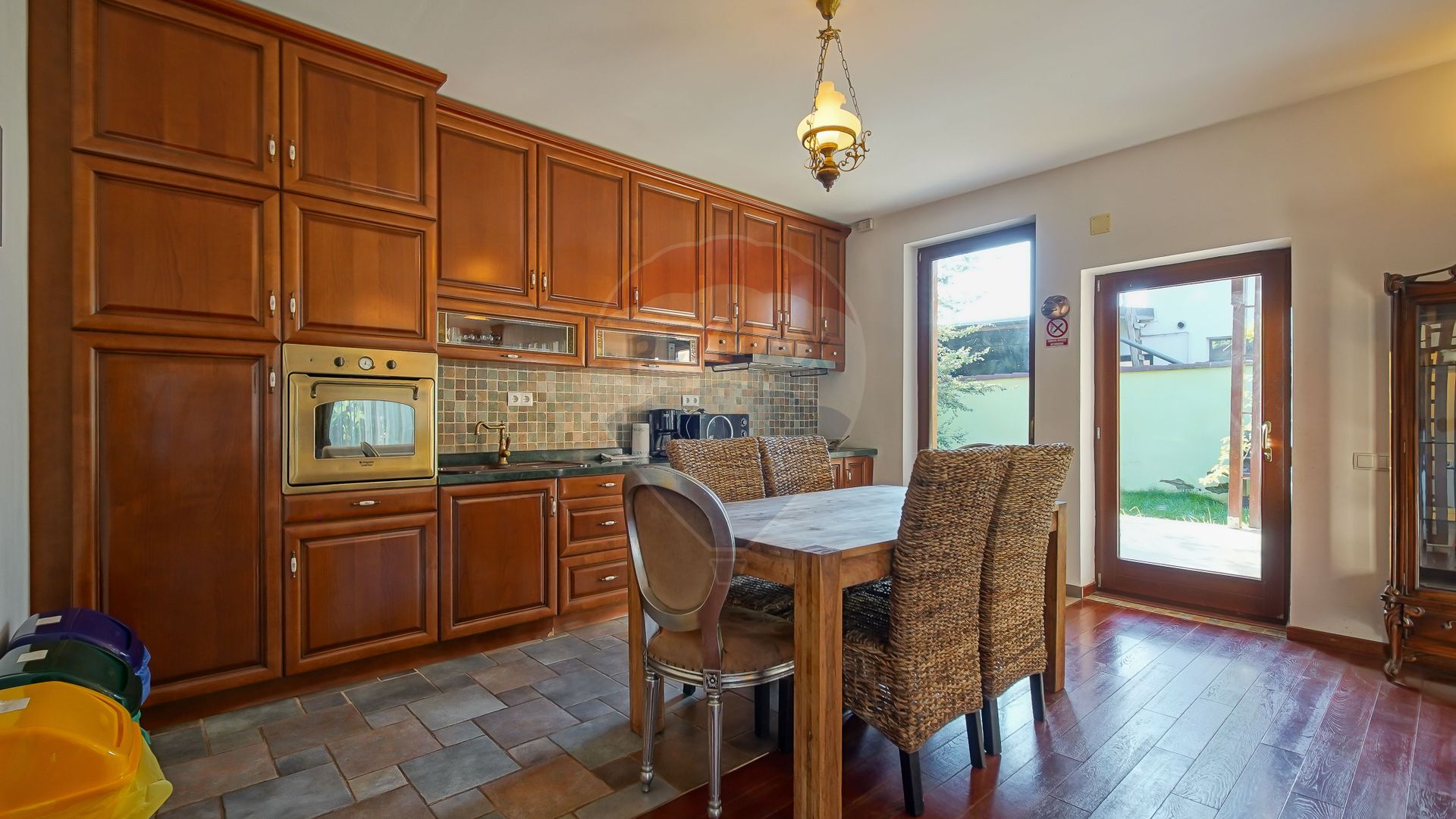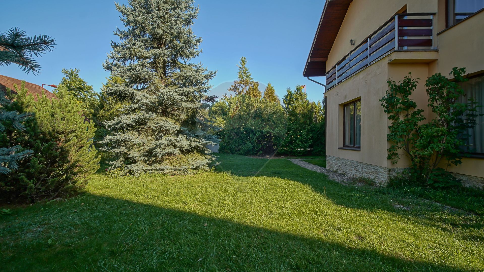 Terenul de 711 mp este plin de vegetație matură și arbuști care formează un cadru natural spectaculos și protejează casa de privirile trecătorilor. Veți simți de la prima vizită că e un loc care inspiră liniște și siguranță. Accesul este exclusiv – doar cei care locuiesc aici sau au treabă pot intra în zonă.