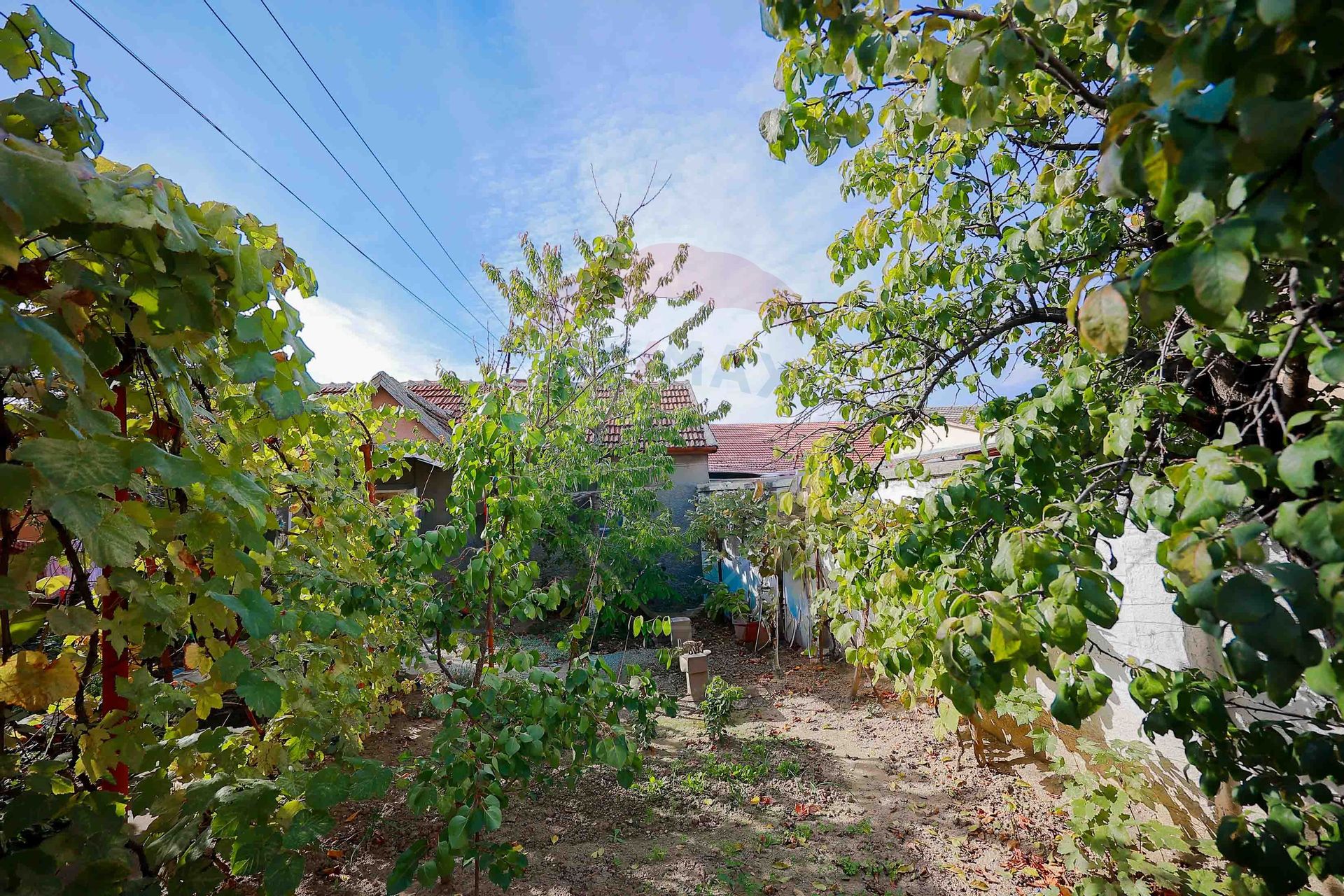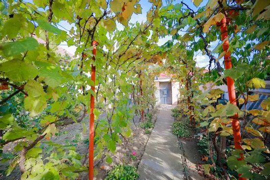 Curtea oferă un colț de natură autentică – grădină cu pomi fructiferi, inclusiv doi cireși maturi și o vie bogată, care creează o atmosferă plăcută și răcoroasă în zilele de vară.