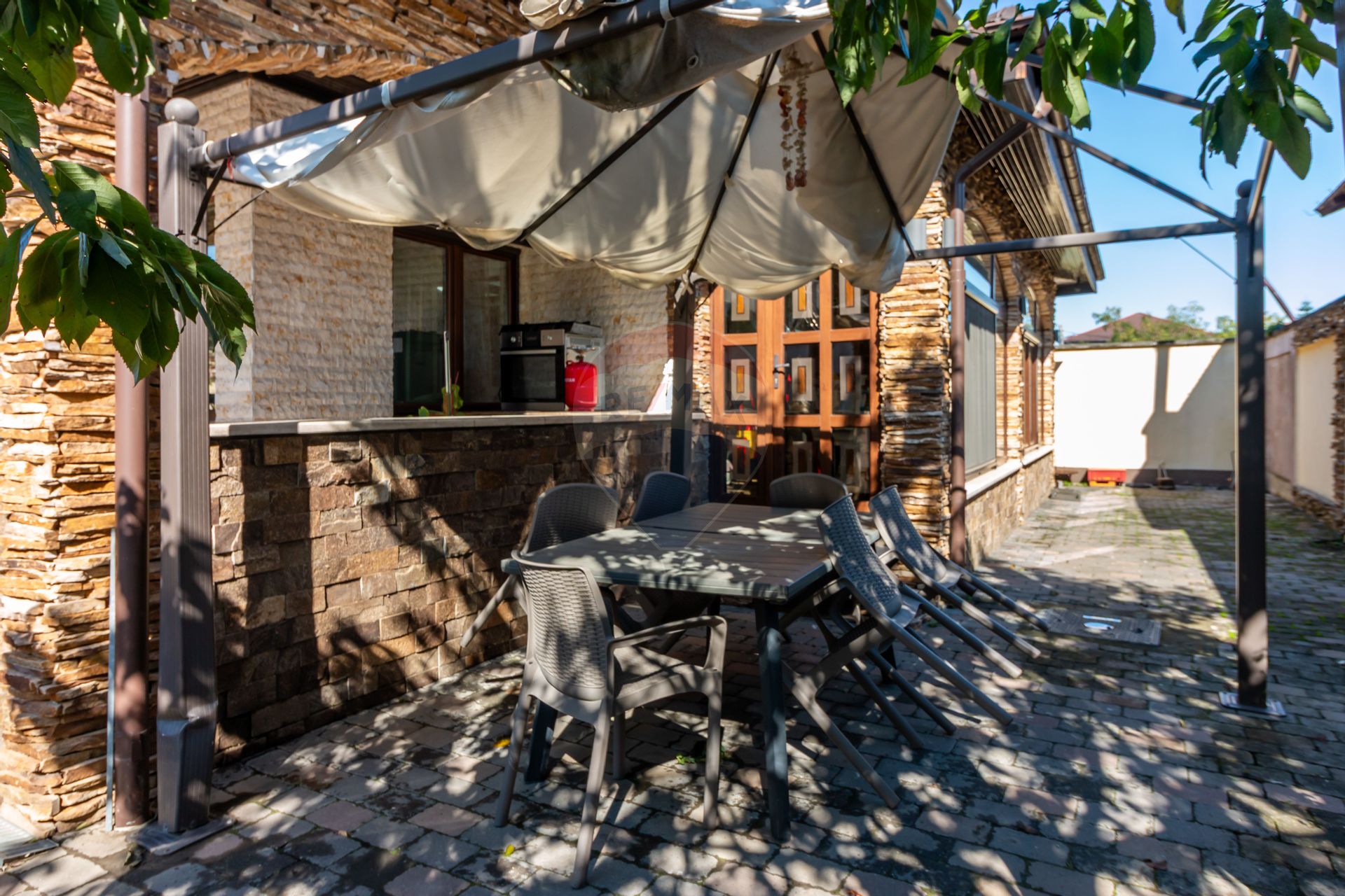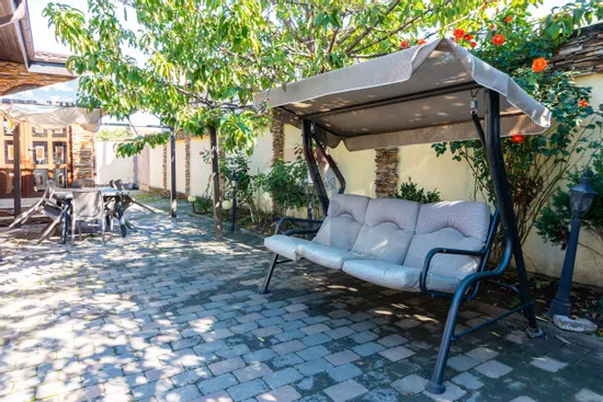 Curtea amenajată dispune de 3 locuri de parcare, zonă de grătar și spațiu liber pentru relaxare sau joacă.