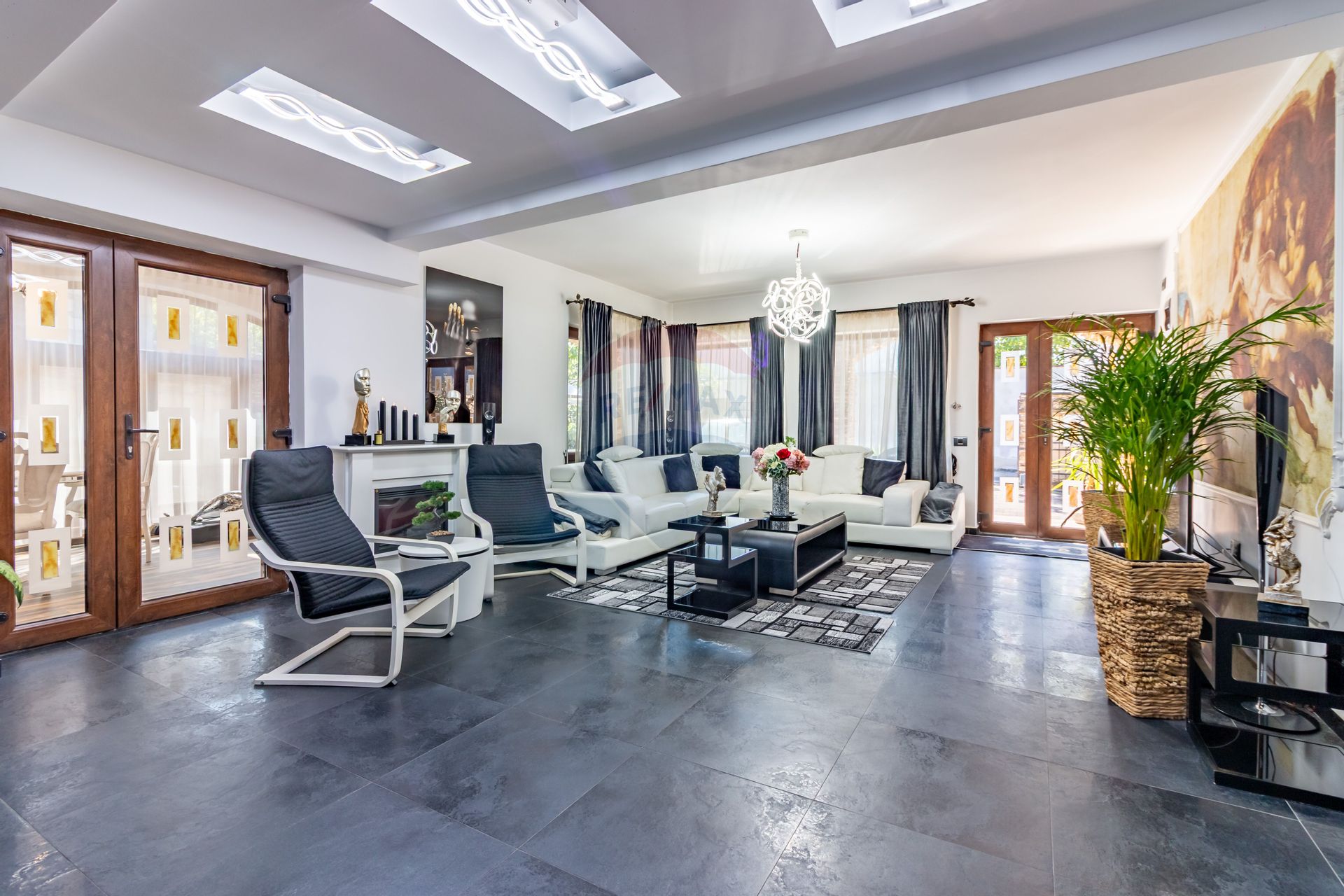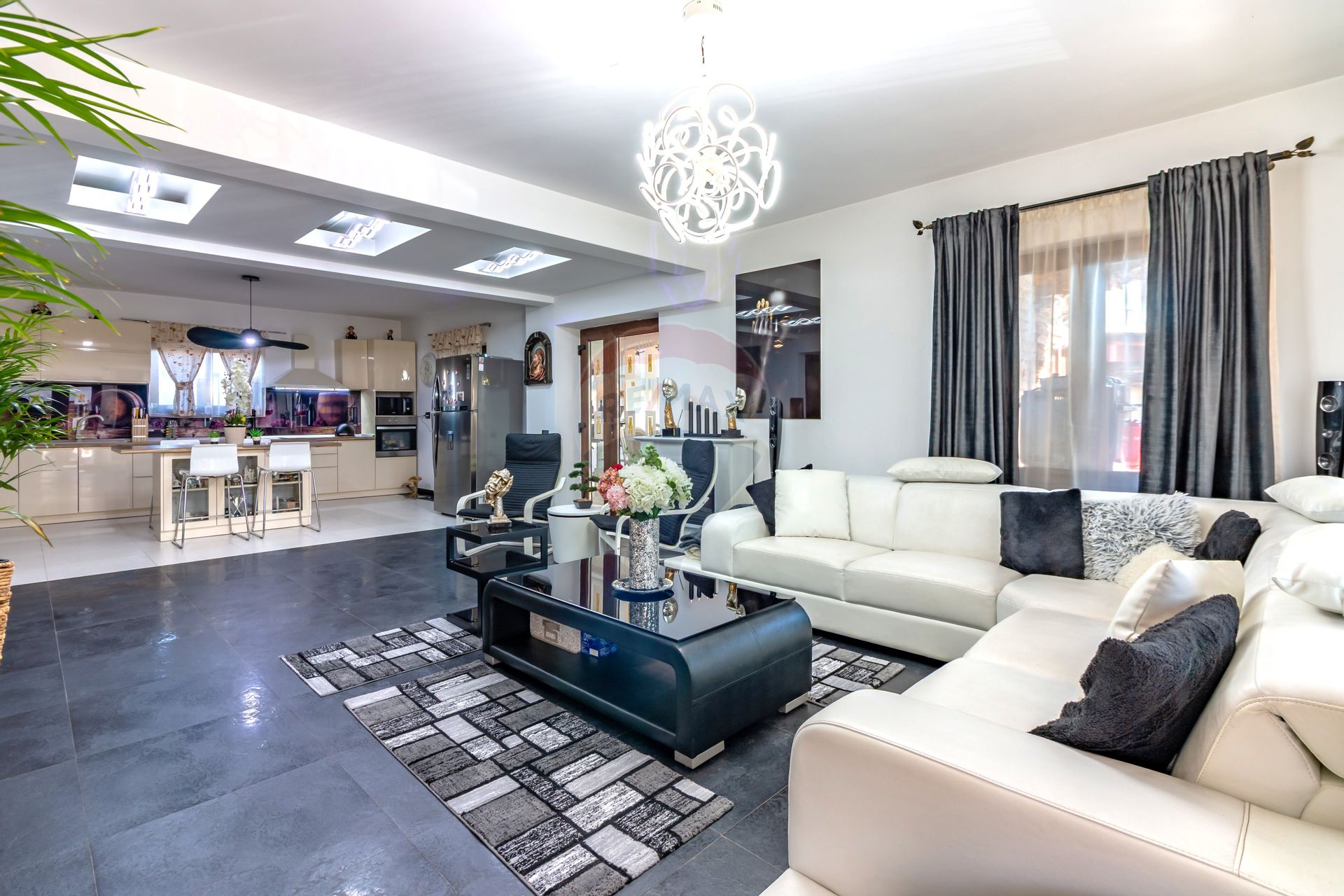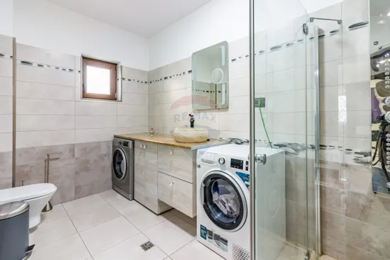 La parter, se afla livingul impresionant de spațios și bucătărie open-space, ce se continuă către o terasă închisă, amenajată ca spațiu ideal pentru cine în familie sau seri relaxante alături de prieteni. Tot aici se regăsește un dormitor si o baie, camera tehnică și accesul către un beci practic.