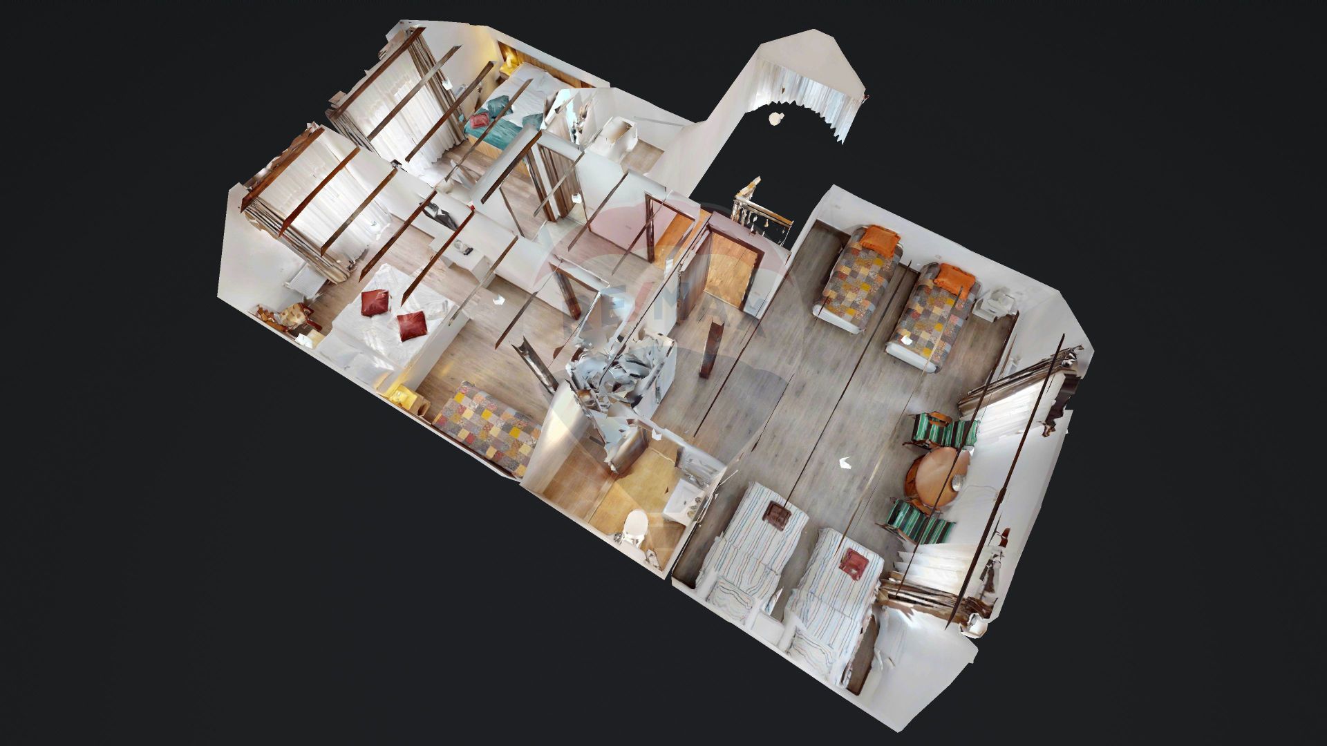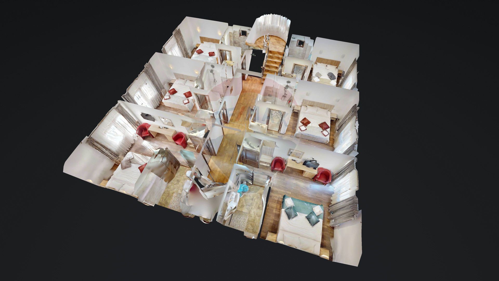 • 6 dormitoare matrimoniale, fiecare cu baie proprie și balcon