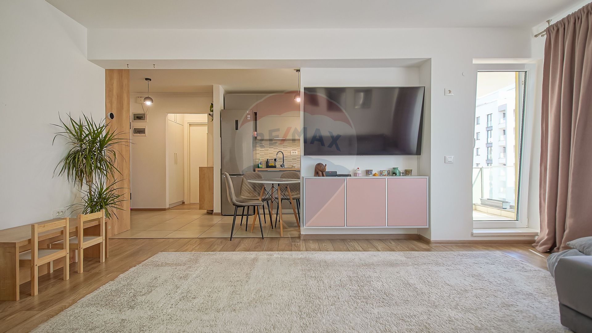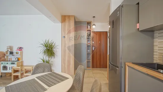 Suprafața interioară este de 52,8 mp utili, plus un balcon de 4 mp și o terasă acoperită de 12 mp. Se vinde exact așa cum îl vezi: mobilat și utilat cu electrocasnice premium: plită și cuptor Samsung, hotă Bosch, frigider LG, cuptor cu microunde încorporabil Siemens, mașină de spălat vase Whirlpool, mașină de spălat Samsung și uscător Samsung.