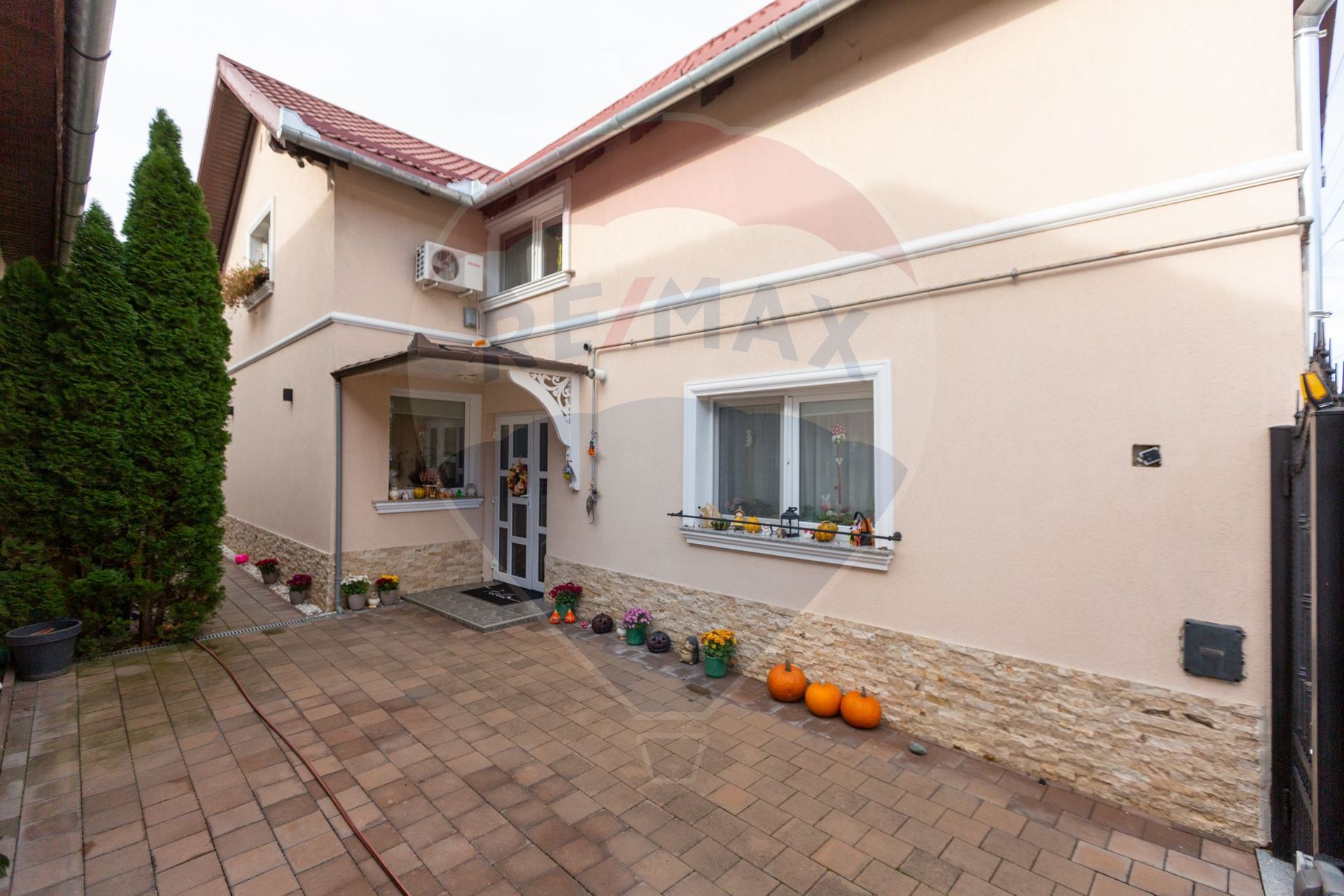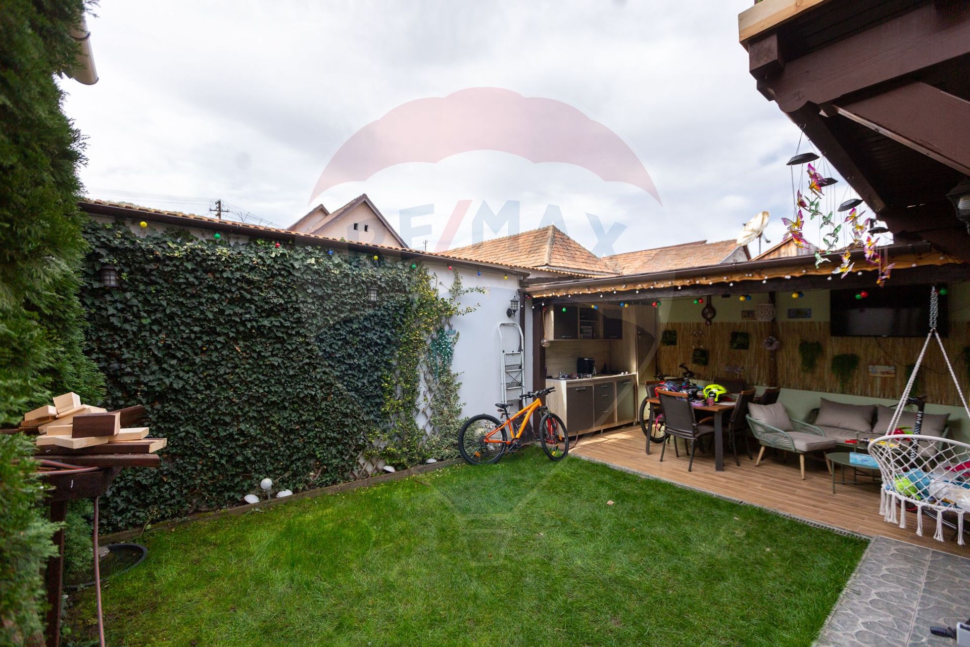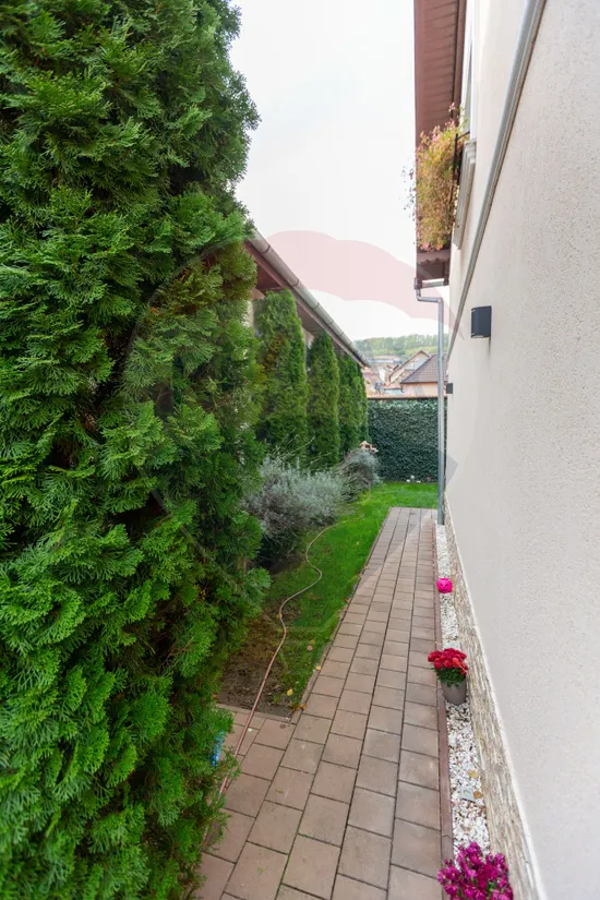 Curte amenajată cu gazon, pavaj si verdeață